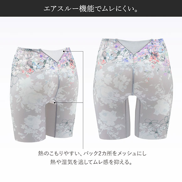 熱のこもりやすいクロッチから内ももと腰上部をメッシュにすることで、歩くたびに空気が入れ替わり、ムレにくく快適にする【エアスルー機能】で、通気性よく仕上げています。