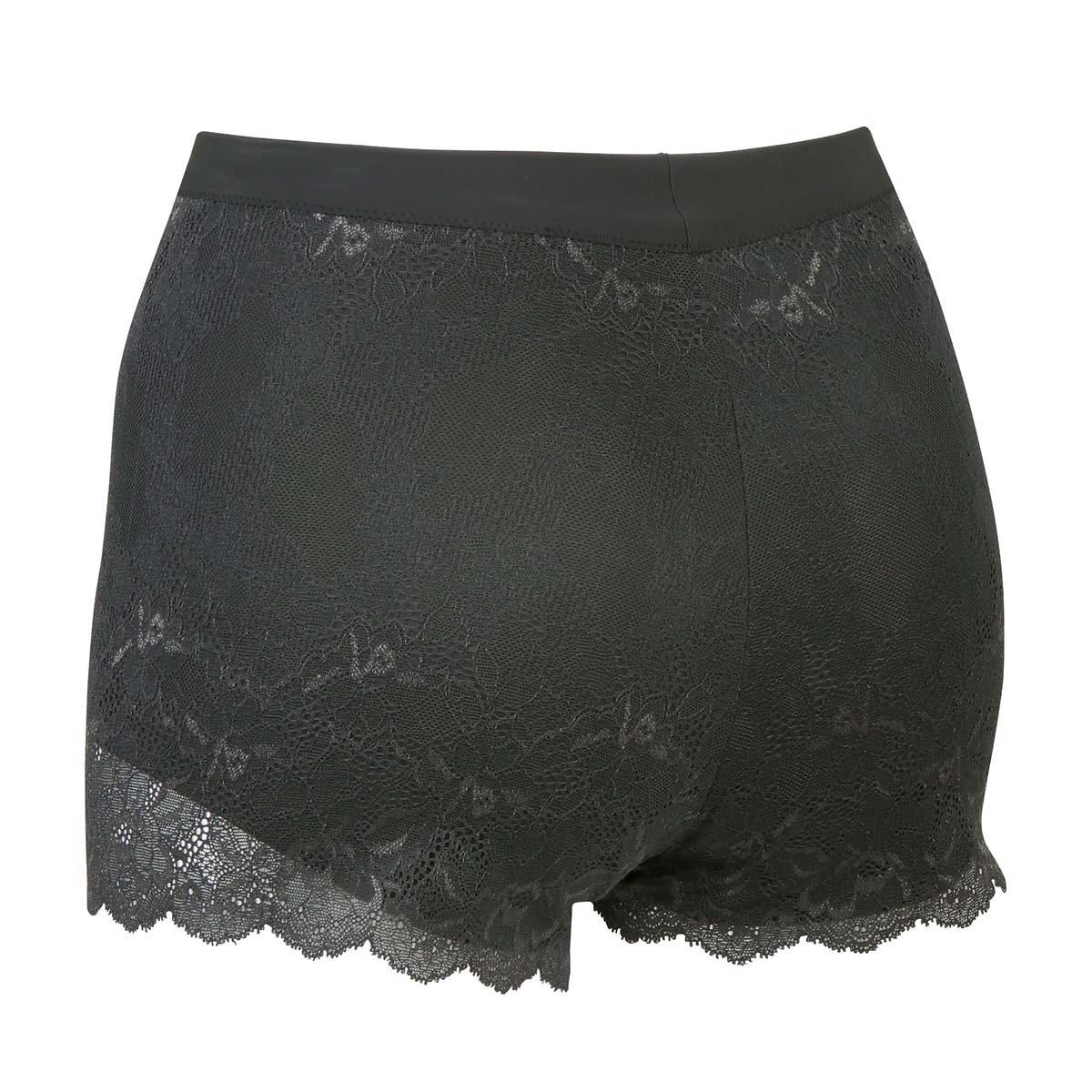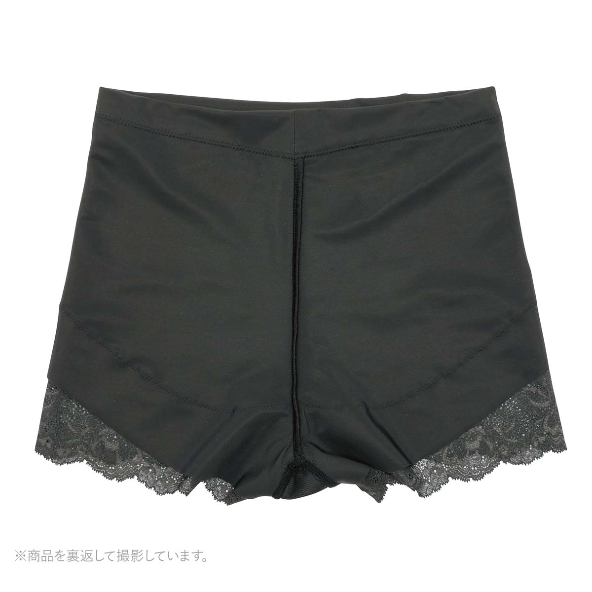 ヒップ下のパワーネットでヒップを持ち上げることで、脚長シルエットを追求。おなかは横に伸びない裏打ち素材で、しっかりフラットに。ウエストはよく伸びるベアスムース素材を折り返し始末にすることでほどよくスムージング。