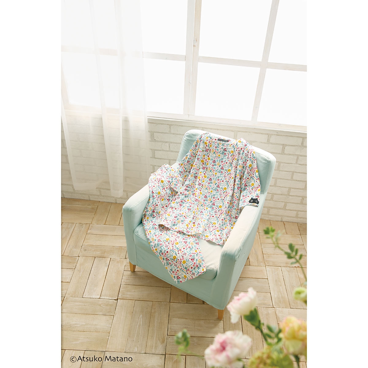 自然や暮らしの小さなモチーフが集まった、見ているだけで穏やかな雰囲気に包まれるような、やさしい色合いのテキスタイル。左袖口の黒猫のアップリケがデザインポイント♪