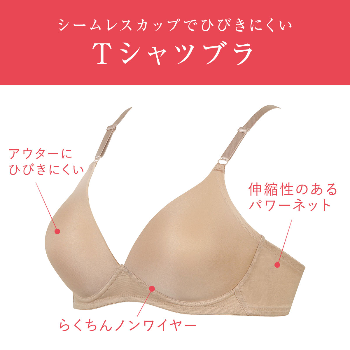 アウターにひびきにくい、シームレスカップのノンワイヤーTシャツブラ。