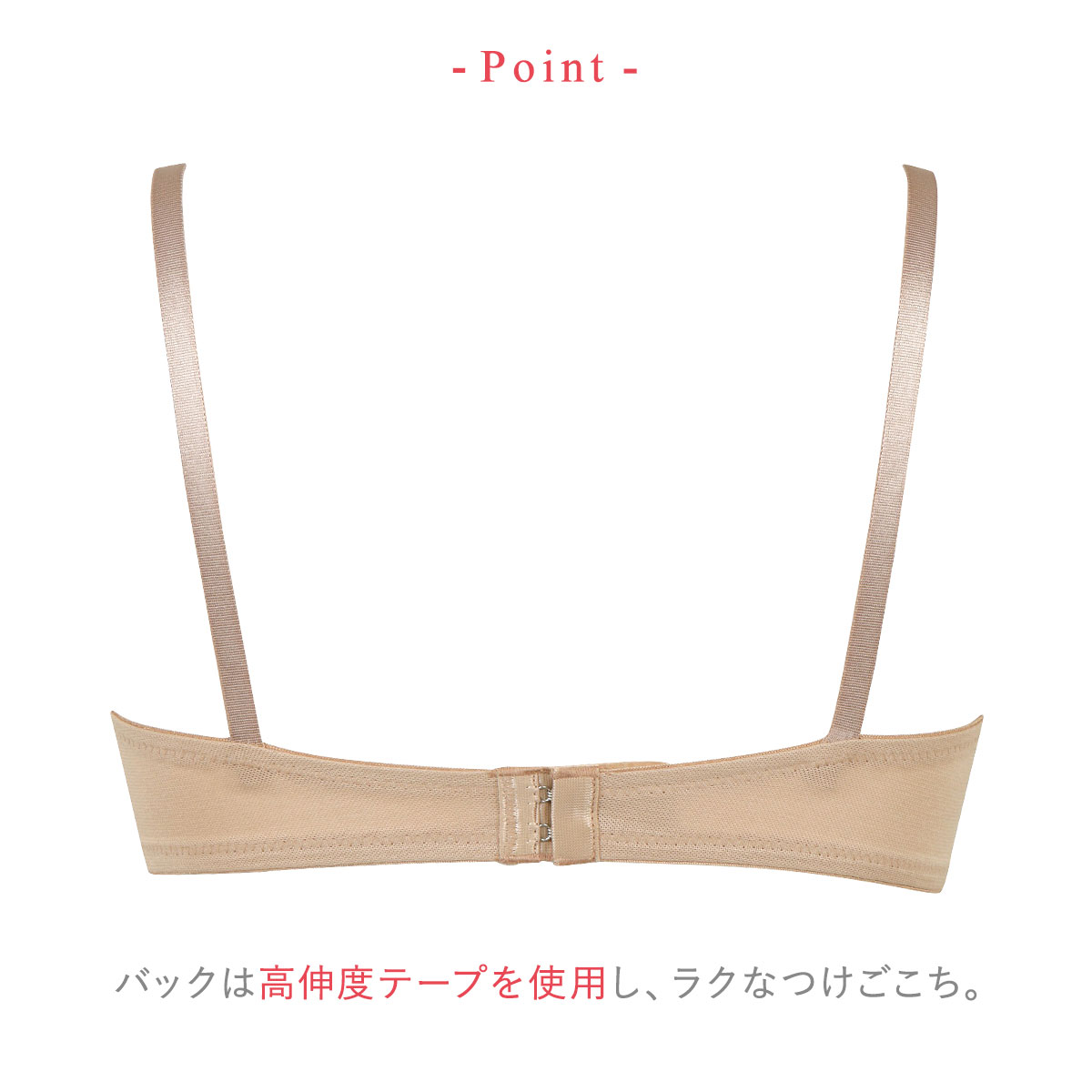 アンダーには伸縮性のあるパワーネットを使用し、らくちんなノンワイヤーでありながら、バストをきちんとささえます。