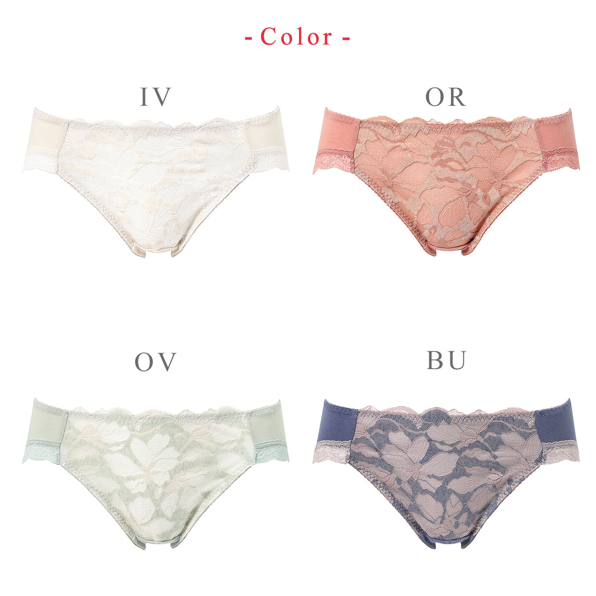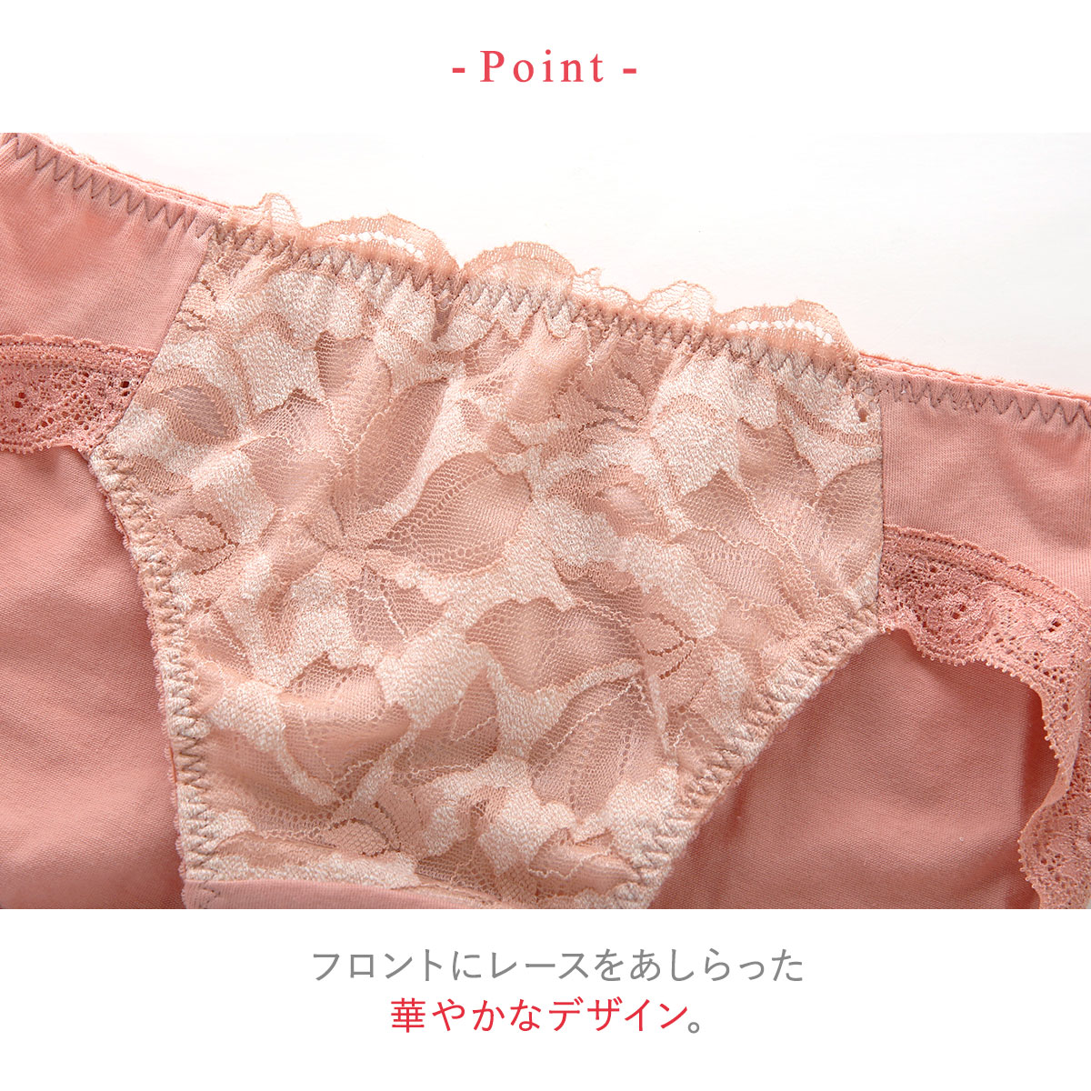 はきこみ丈あさめ、脚さばきのよいハイレッグタイプ。フロントにレースをあしらった華やかなデザインです。