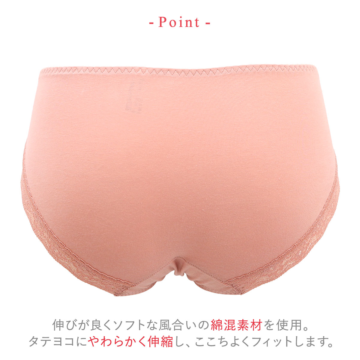 ウエストと前裾に伸縮性のよいテープを使い、やさしく履き心地。後ろ裾はくいこみにくく、アウターにひびきにくいストレッチレース仕上げです。
