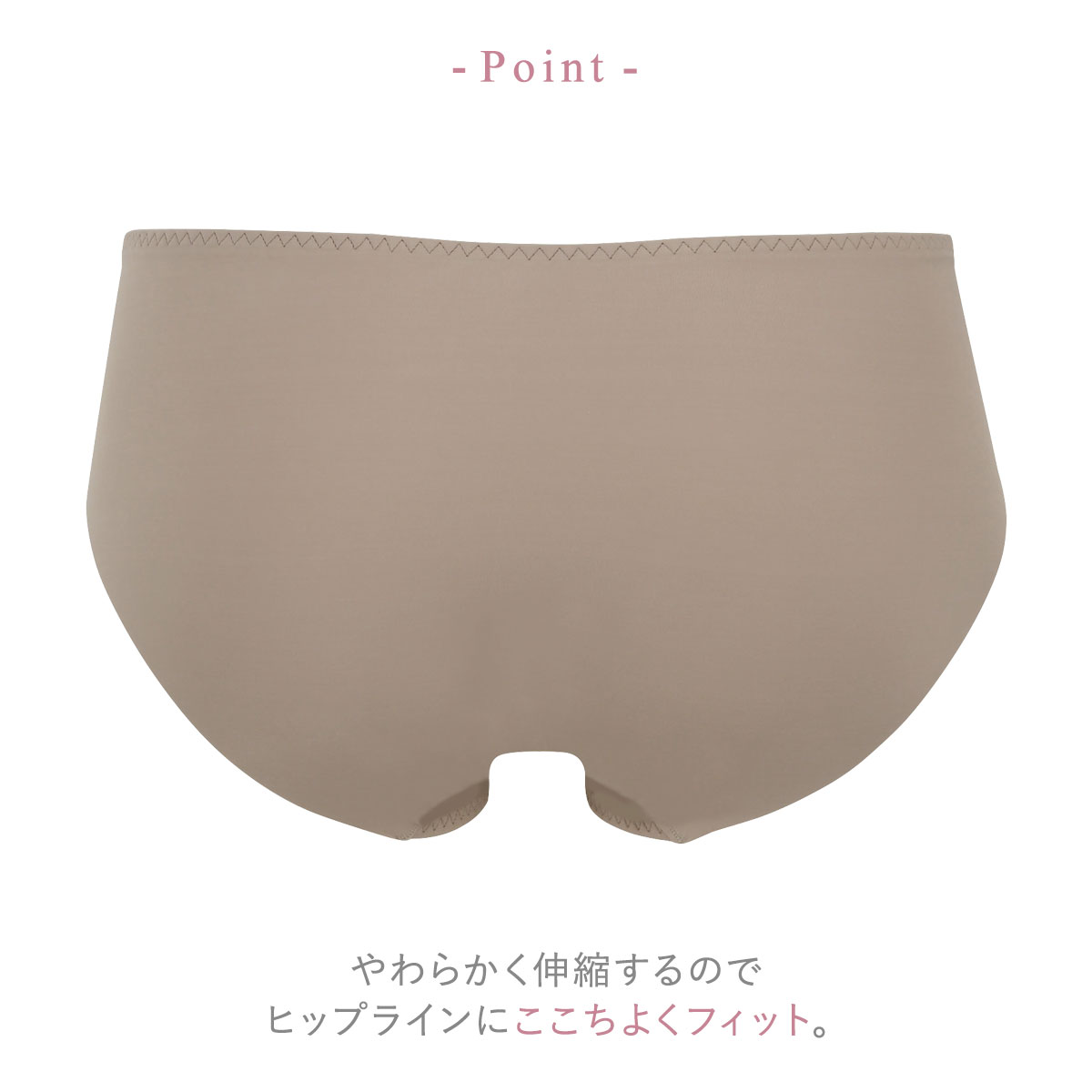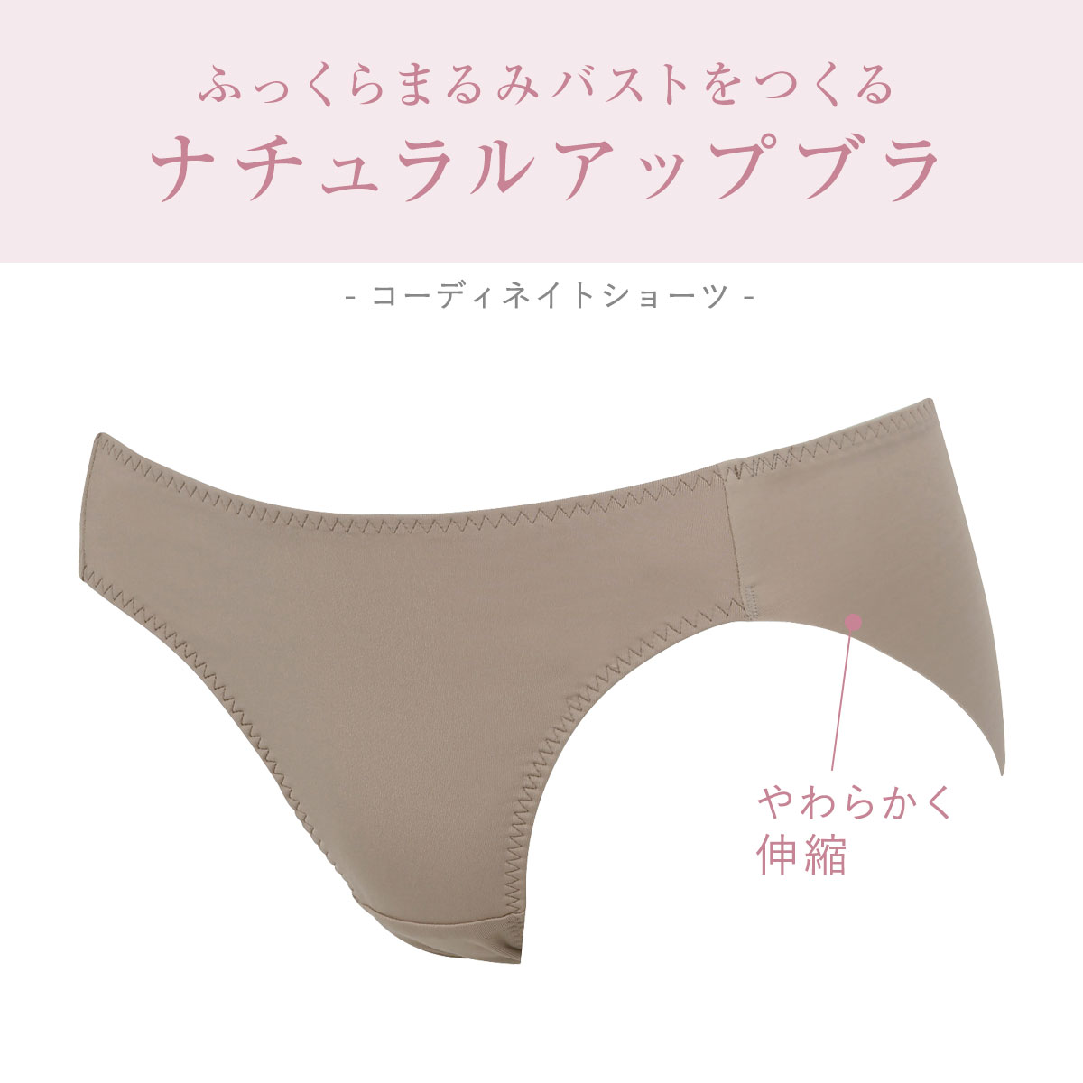 ふんわりナチュラルに、自然なまるみでバストアップする【ナチュラルアップブラ】コーディネイトショーツです。ブラジャーのストラップとカラーをリンクさせたゴムテープ使いが、さりげなくおしゃれ。