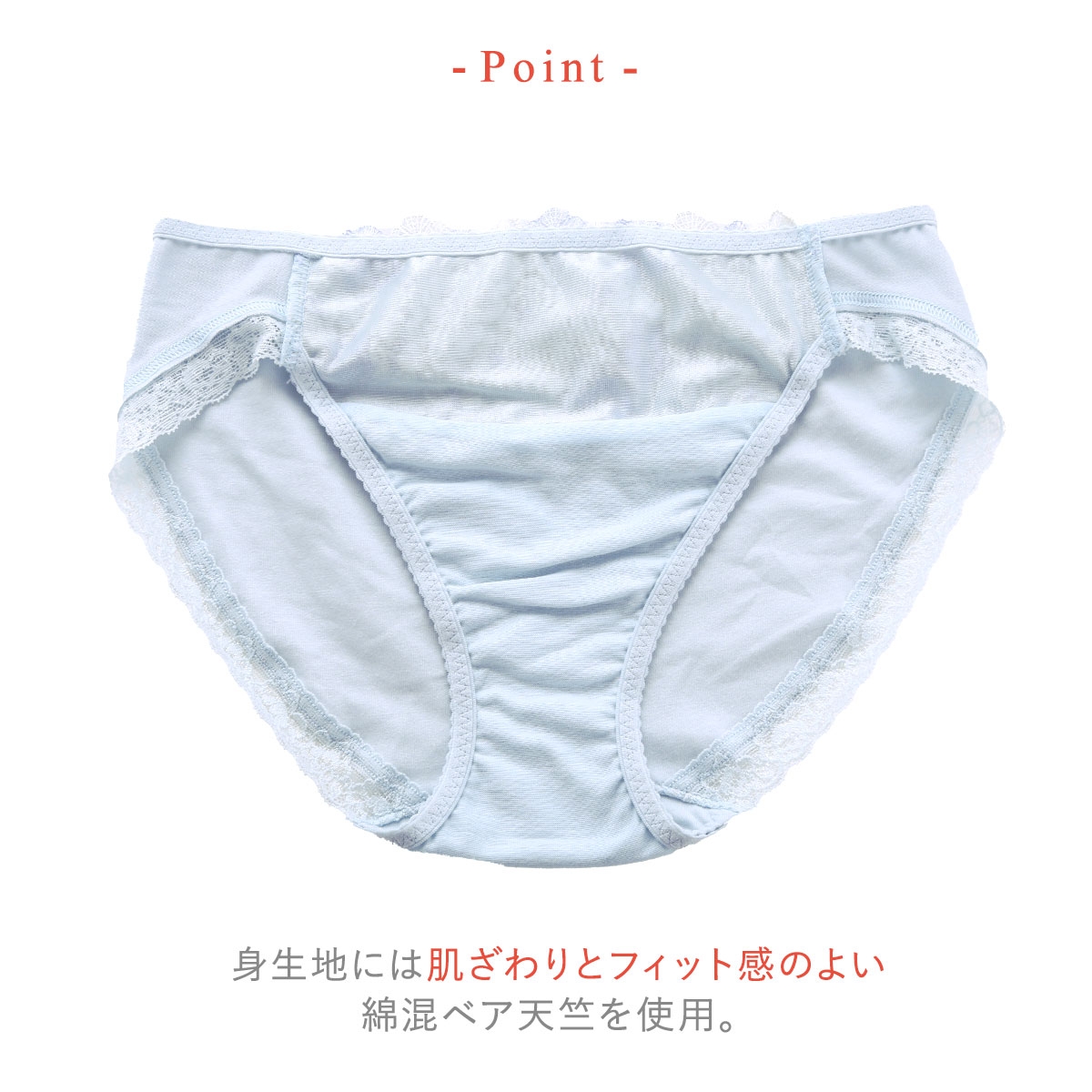 身生地には肌ざわりとフィット感のよい綿混ベア天竺を使用。タテヨコナナメにやわらかく伸縮するため、ヒップラインにここちよくフィットします。