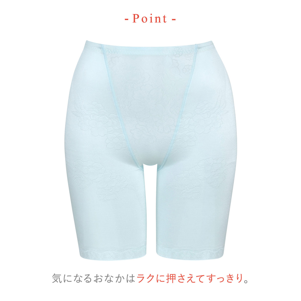 太もも内側は強いパワーで押さえ、前側は弱めのパワー感でズレ上がりを軽減し、綺麗なシルエットに。
