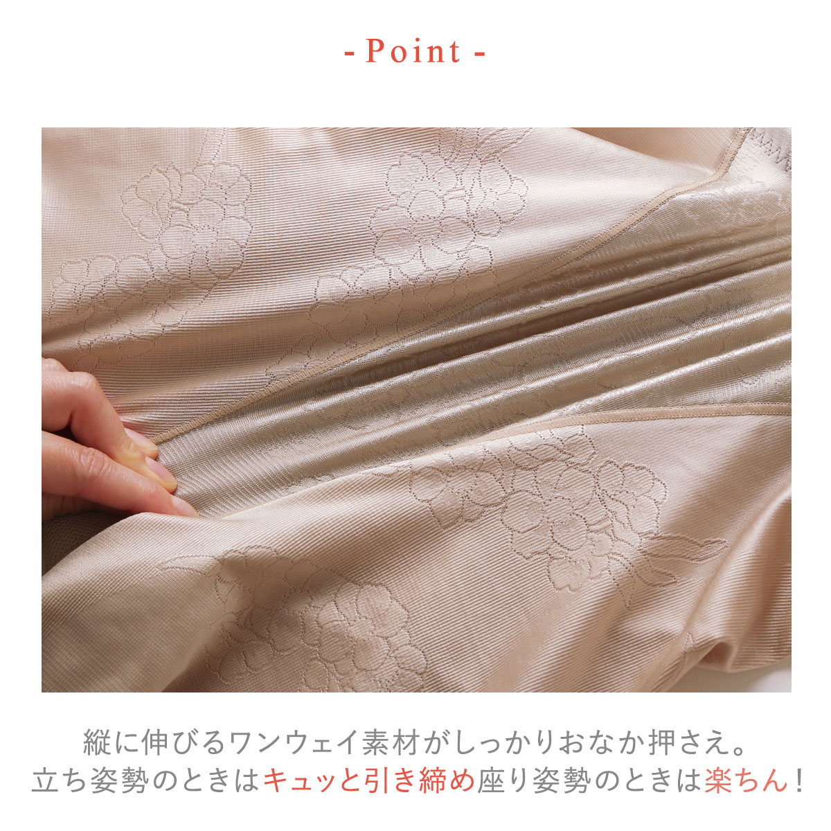 身生地には、タテヨコによく伸び、サポート感のある素材を使用。腹部は、横には伸びず縦に伸びるワンウェイ素材がしっかりとぽっこりおなかをおさえます。縦に伸びるおかげで、立ち姿勢のときはキュッと引き締め、座り姿勢のときは楽ちん!を叶えます。