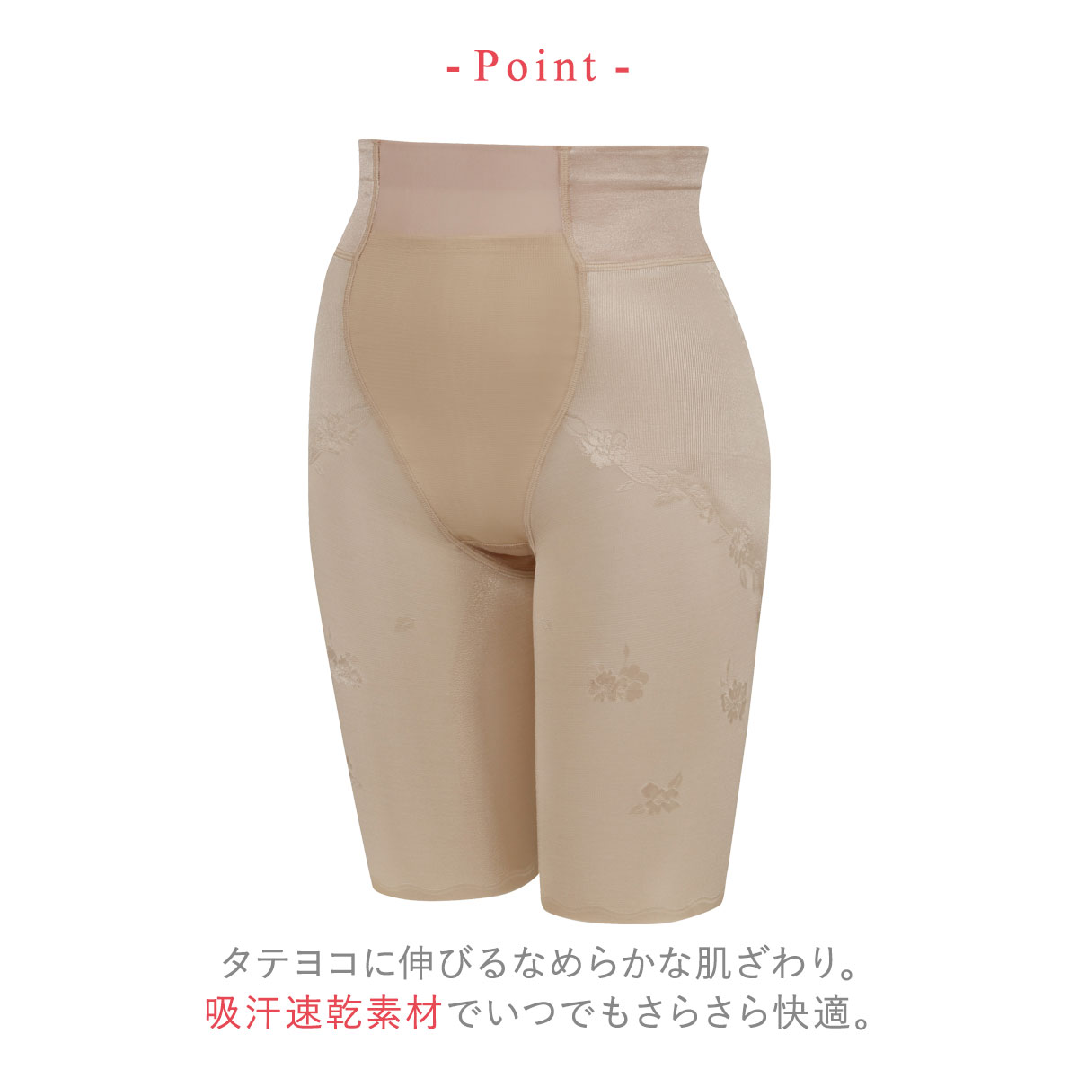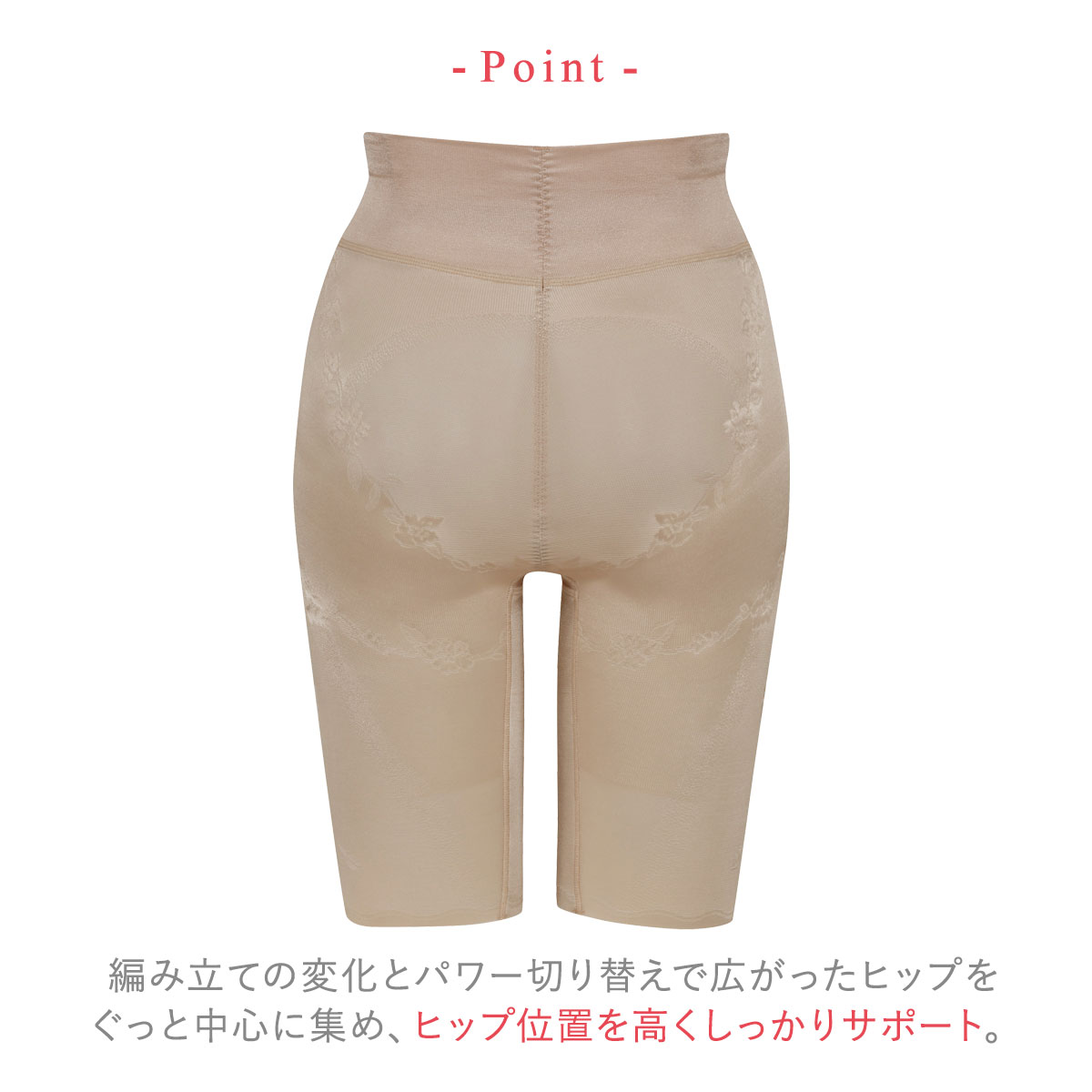 少し高めのウエスト丈で気になるウエストのハミ肉をすっきり包み込み、しっかりホールド。フロントは二重構造でおなかを押さえ、編み立ての変化とヒップ部のパワー切り替えでヒップアップもしっかりサポート。
