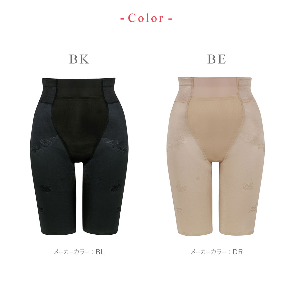 少し高めのウエスト丈で気になるウエストのハミ肉をすっきり包み込み、しっかりホールド。フロントは二重構造でおなかを押さえ、編み立ての変化とヒップ部のパワー切り替えでヒップアップもしっかりサポート。