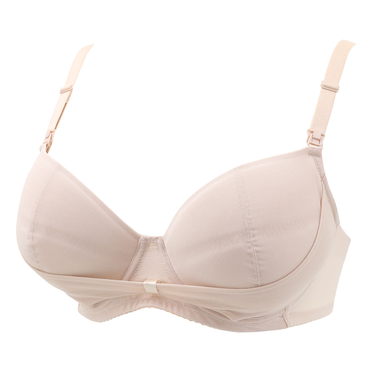 伸縮性のあるカップを使用し、産前~産後の授乳前後のバストボリュームの変化に対応できます。上部に厚みをもたせたピタッとパッド内蔵で、産前~産後・卒乳までのバストボリュームの変化に合わせて自然にボリュームアップし、きれいなバストラインに。