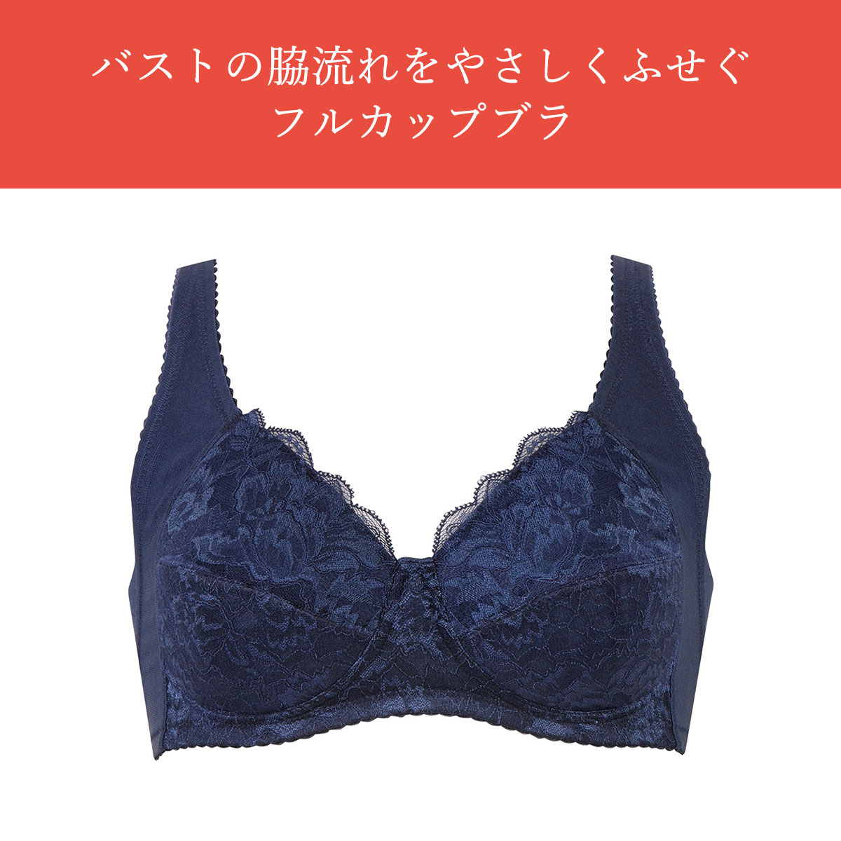 バストの脇流れをやさしくふせぐ、ノンワイヤーのフルカップブラジャー。
