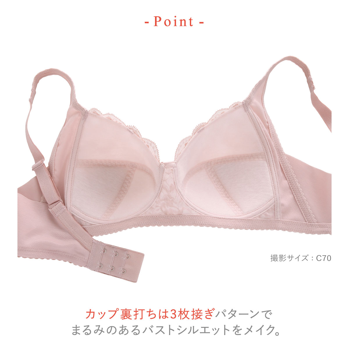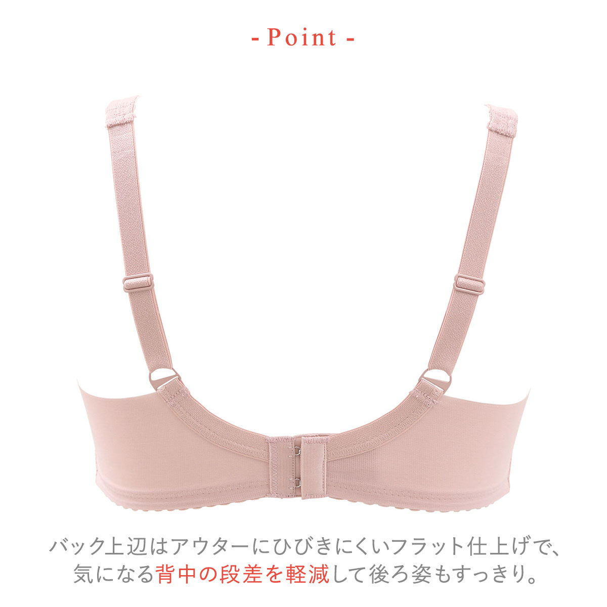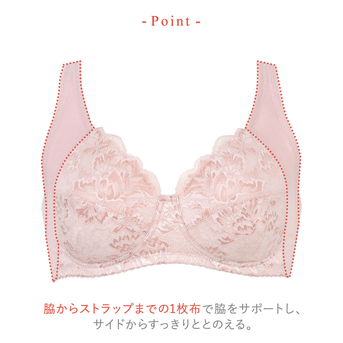 脇からストラップまでの1枚布で脇をサポートし、サイドからすっきりととのえるフルカップブラ。ノンワイヤーのやさしいつけごこちはそのままに、気になるバストの横流れをやさしくふせぐこだわりのサポート設計です。