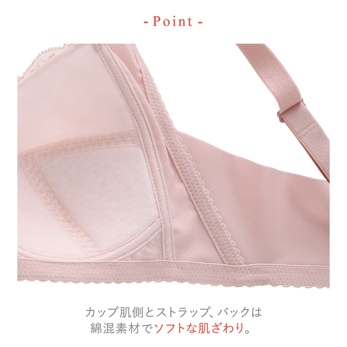 カップ裏打ちは3枚接ぎパターンでまるみのあるバストシルエットをメイク。カップ肌側とストラップ、バックは綿混素材でソフトな肌ざわりです。