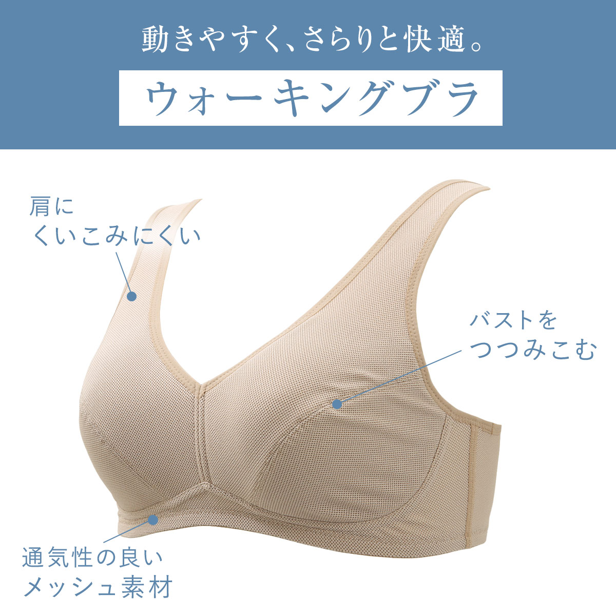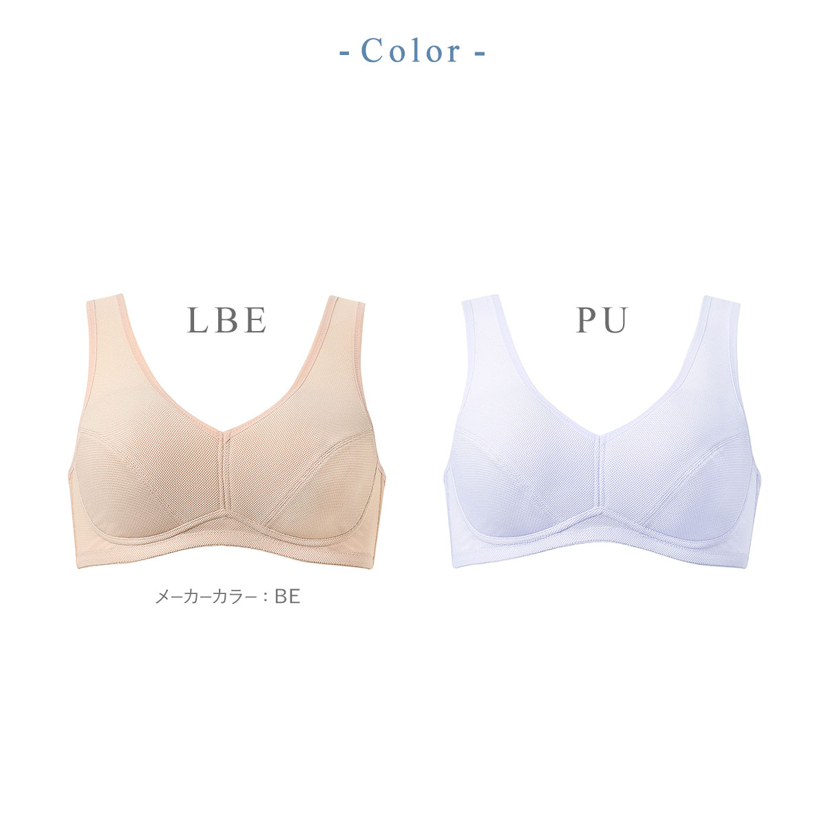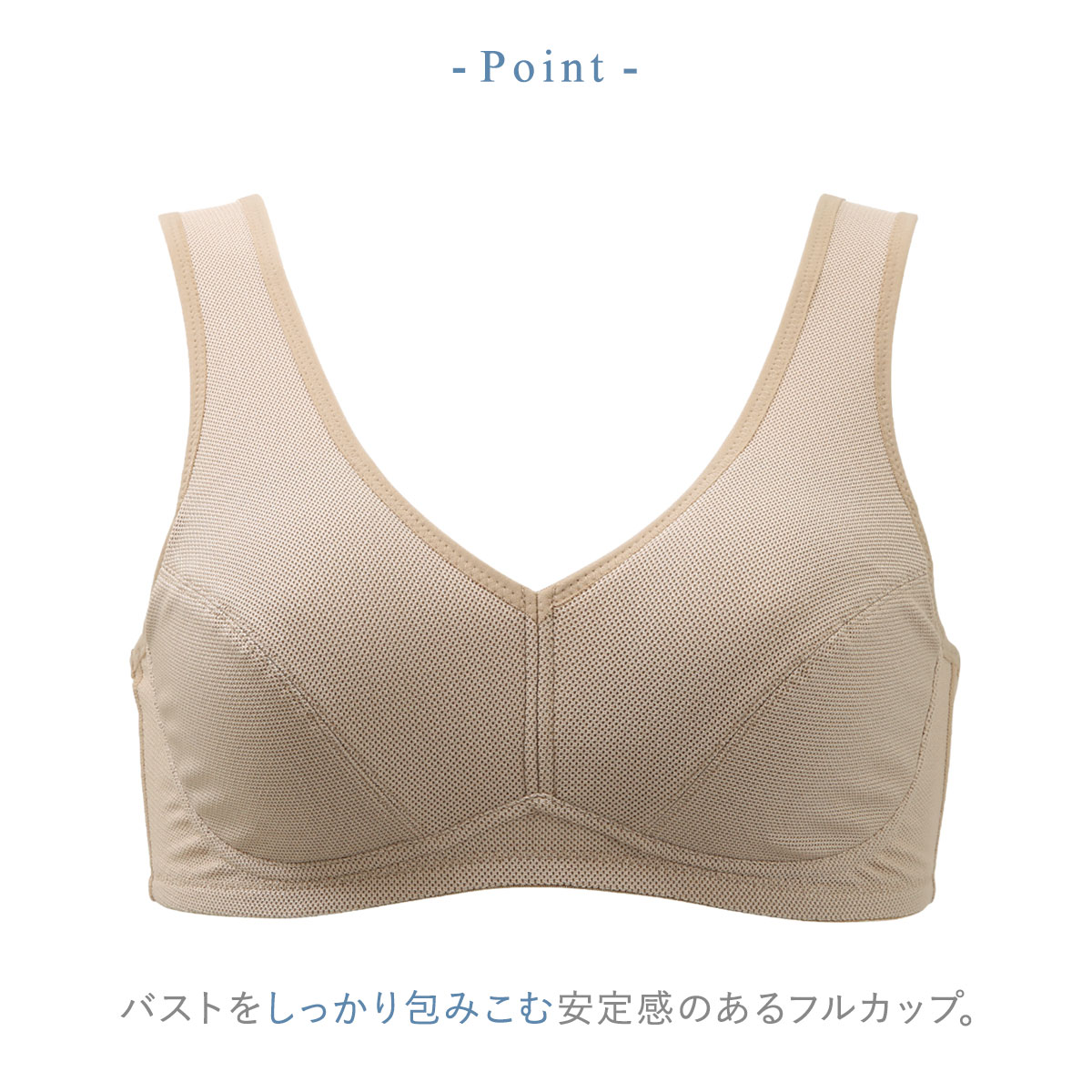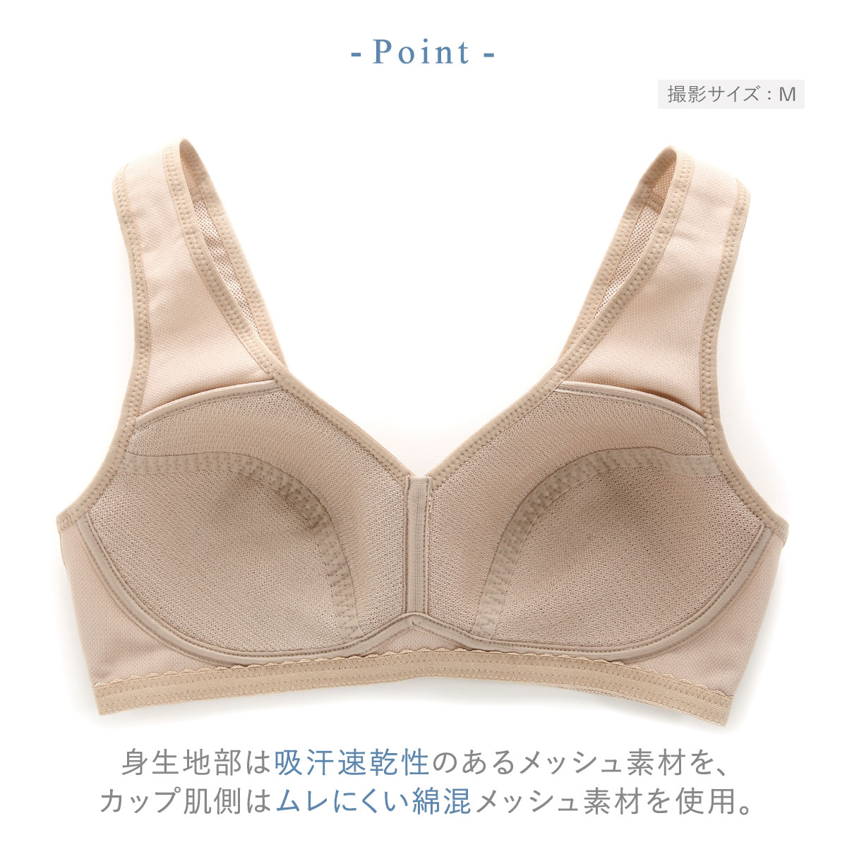 身生地部には吸汗速乾性のあるメッシュ素材を、カップ肌側にはムレにくい綿混メッシュ素材を使用しているので、通気性がよく汗をかいても快適です。