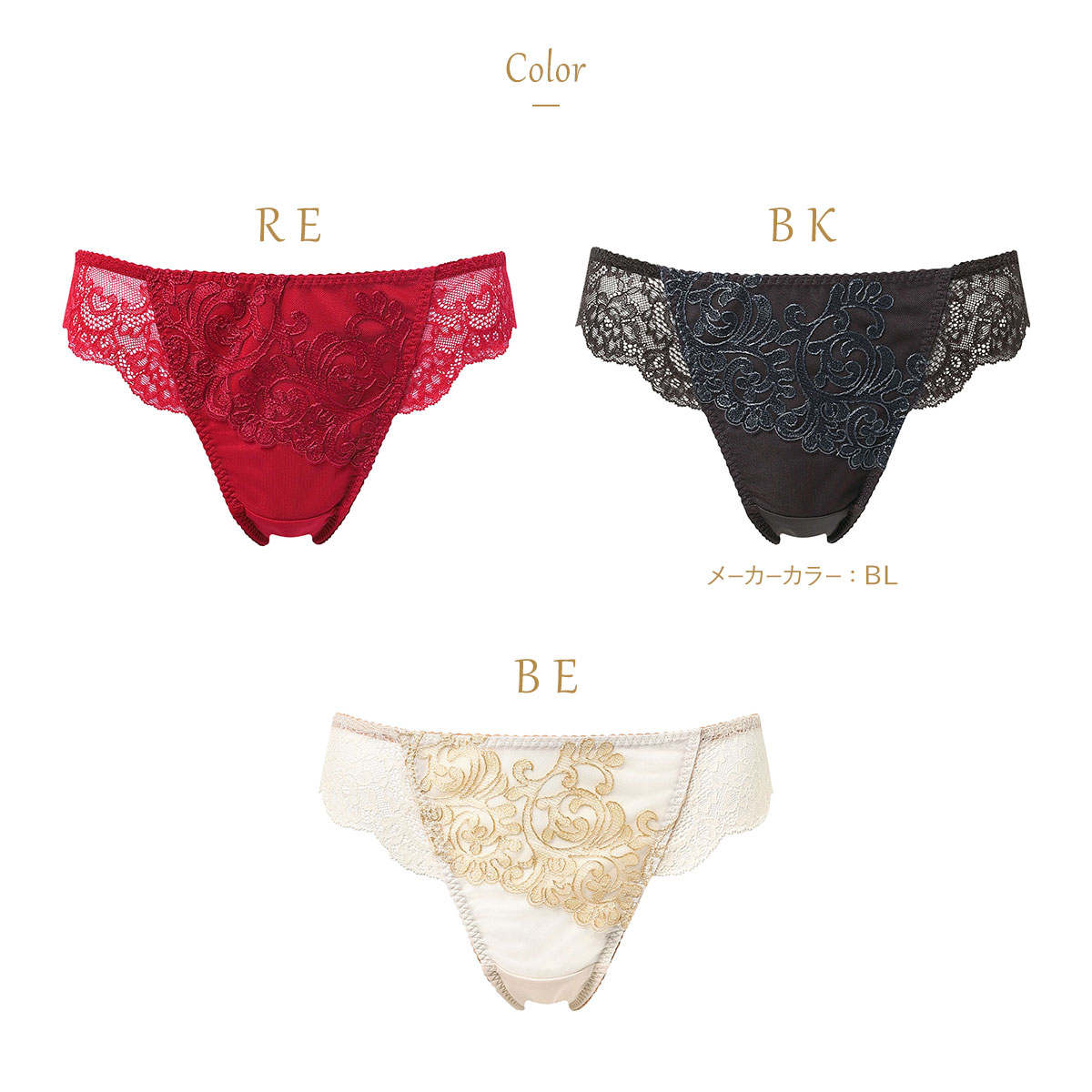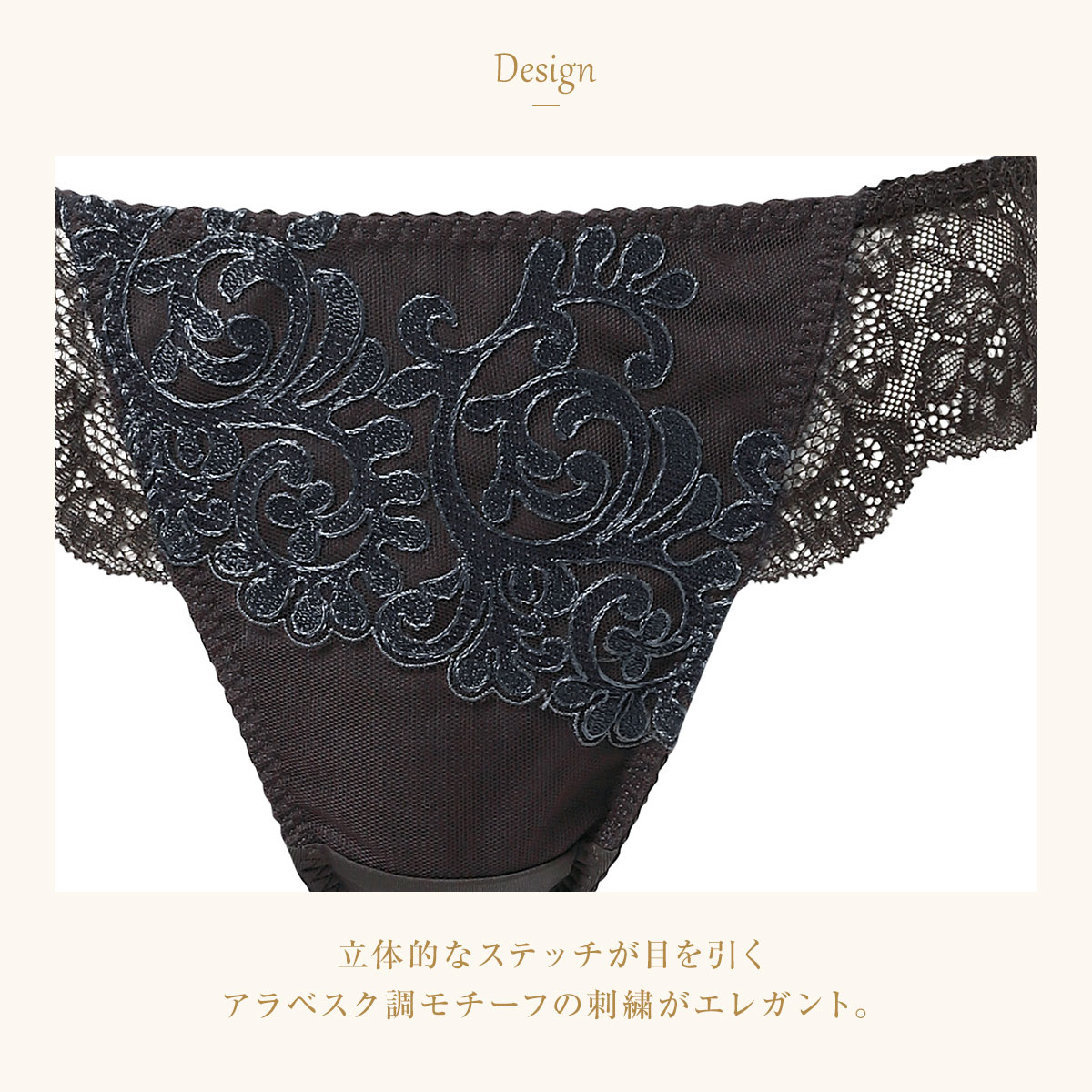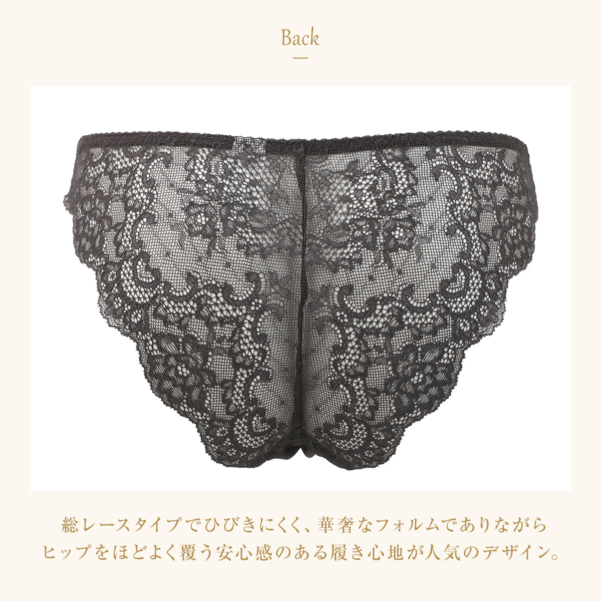 バックは総レースタイプでひびきにくく、華奢なフォルムでありながらヒップをほどよく覆う安心感のある履き心地が人気のデザイン。通常のTバックショーツよりもバックのかぶりが広いので、Tバック初心者の方にもおすすめです。