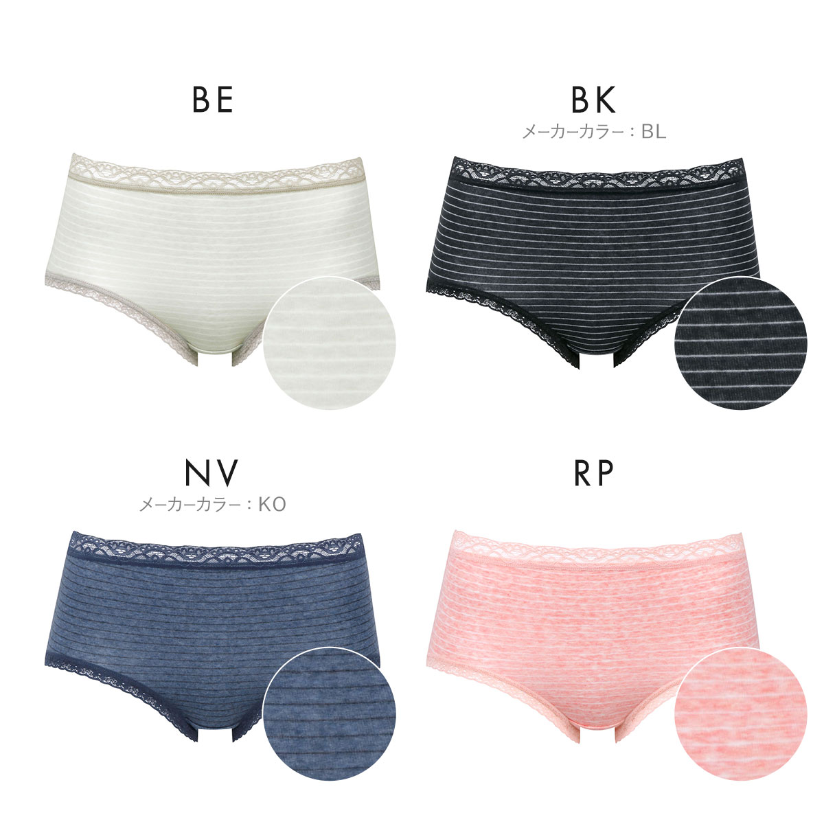 脇に縫い目のない丸編タイプなので、ごろつかずなめらかなはきごこちです。ウエスト、裾周りにはストレッチレースをあしらい、くい込みにくくショーツラインがひびきにくい仕様になっています。