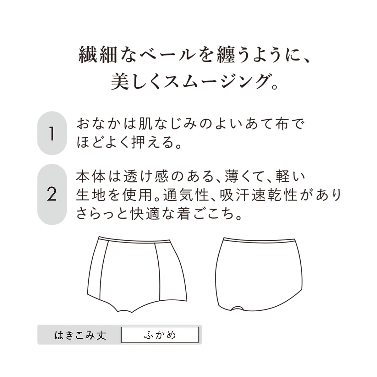 気になるおなかとヒップをサポートするボディサポートショーツ。繊細なベールを纏うような、薄くて、軽くて、やわらかい生地を使用したベールタイプ。