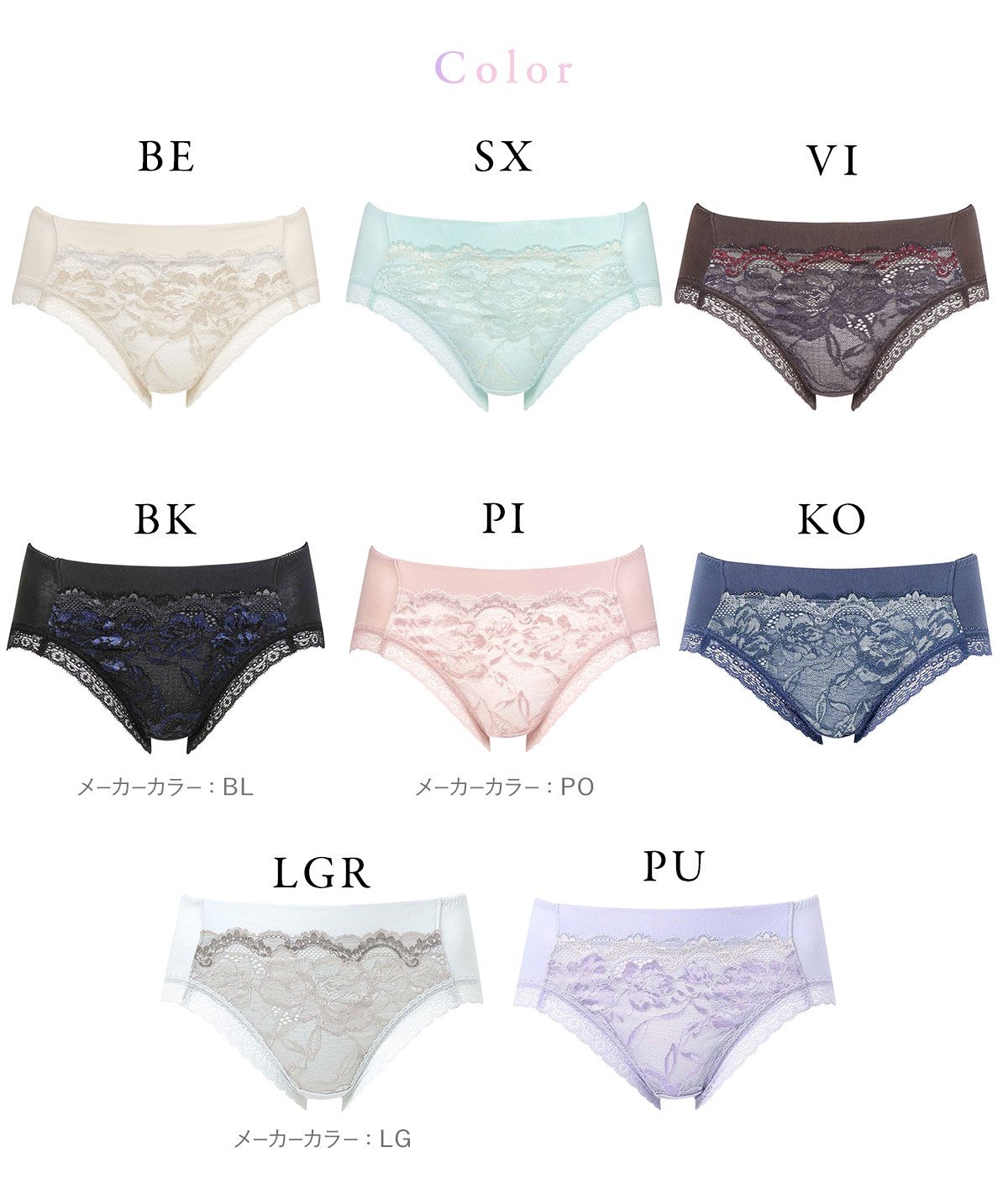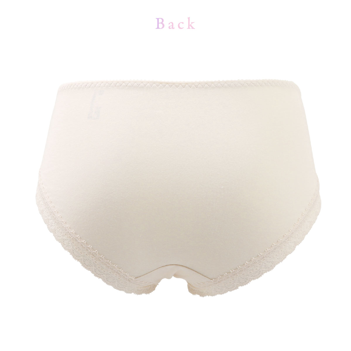 前ウエストを折り返し始末でおなかにくいこみにくく圧迫感を軽減した、ハーフ・ハイカットタイプのショーツ。足裾まわりはストレッチレースで、アウターにもひびきにくい仕様です。身生地は綿混素材を使用し、縦横に伸縮性がありフィット感のあるはき心地。