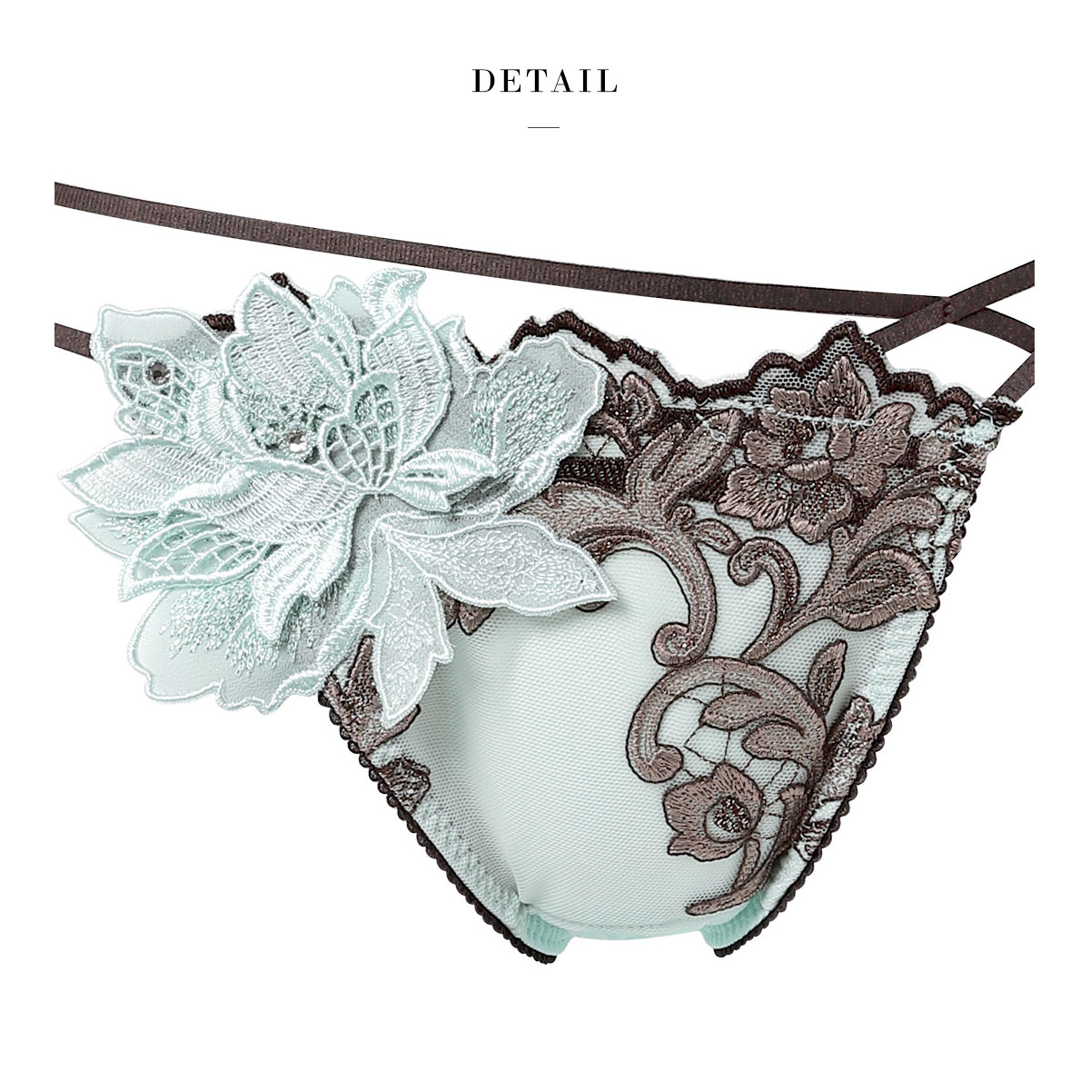 フロントは裏打ち付きで透けにくく、やさしい肌あたり。バックにもアップリケがあしらわれた、セクシーでゴージャスなバックデザインです。