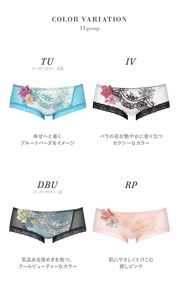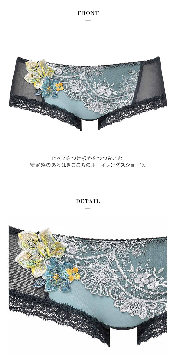 裾は優しい肌あたりでくいこみにくく、ショーツのラインがひびきにくいストレッチレース仕様。バックにもアップリケをあしらい、後ろ姿も華やかに演出。