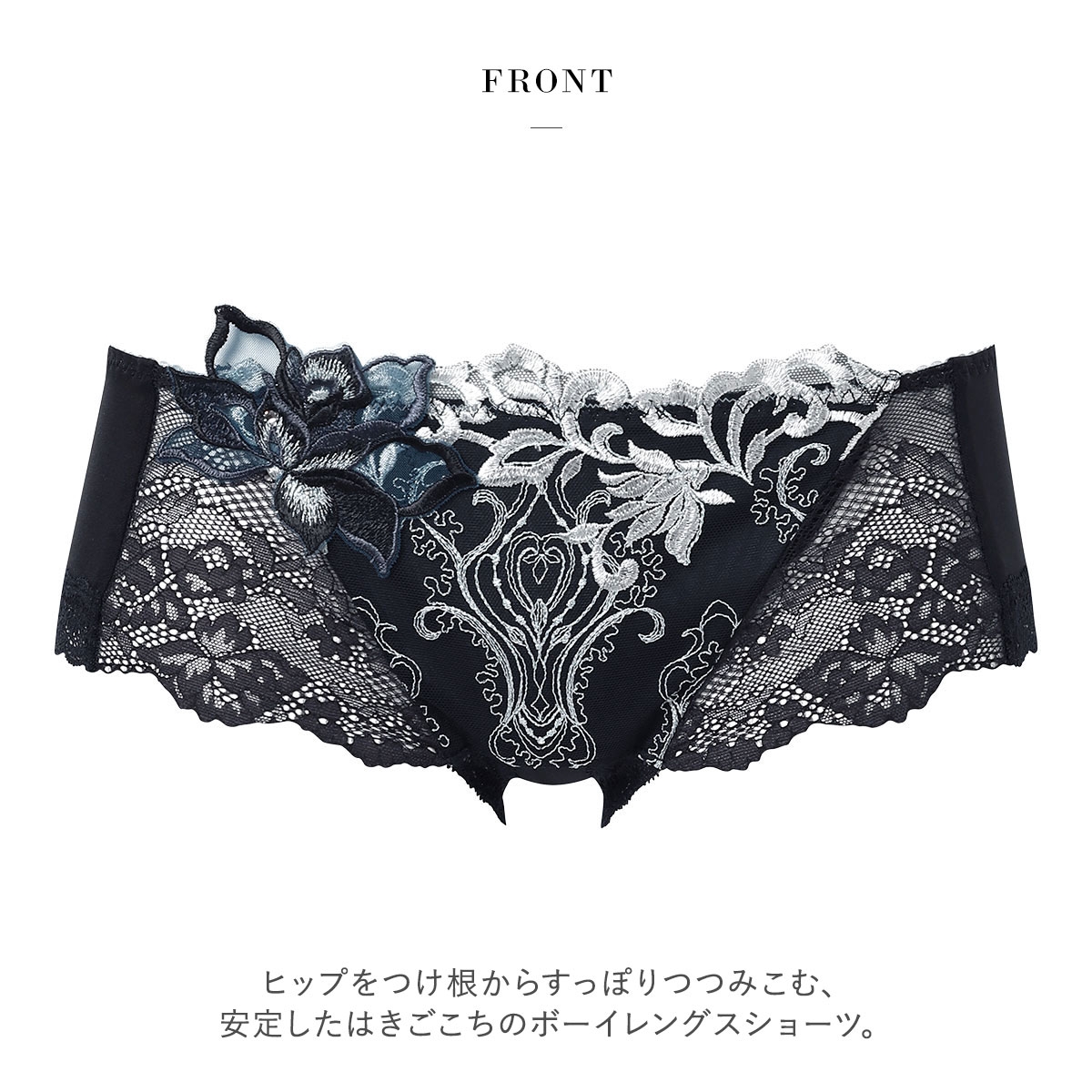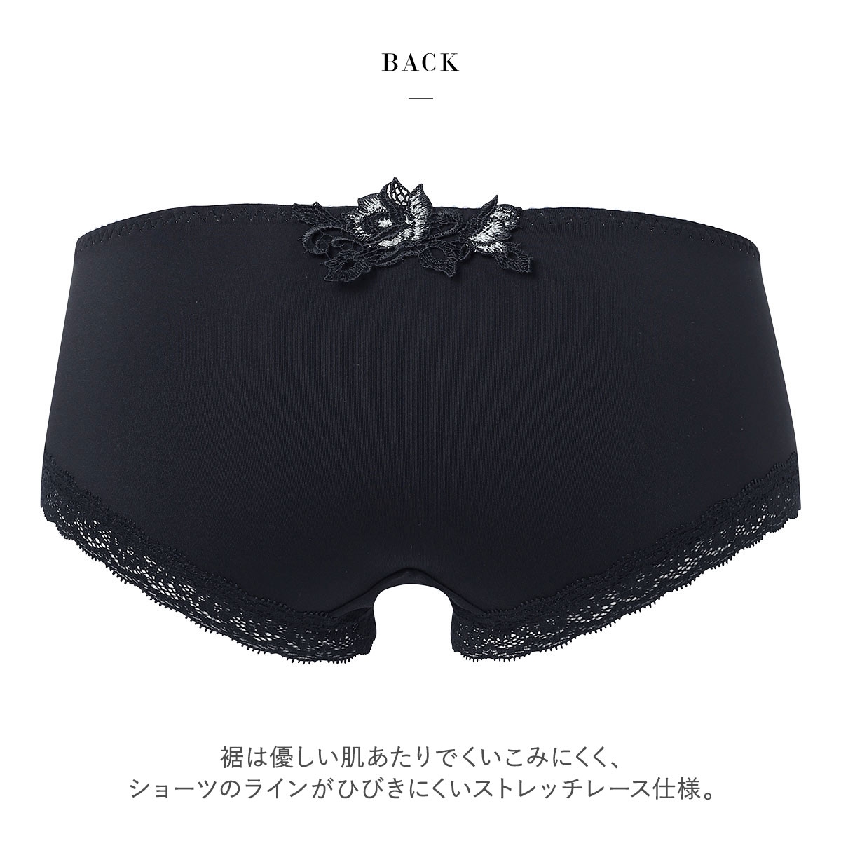 裾は優しい肌あたりでくいこみにくく、ショーツのラインがひびきにくいストレッチレース仕様。フロントは裏打ちつきで透けにくく、優しい肌あたりです。