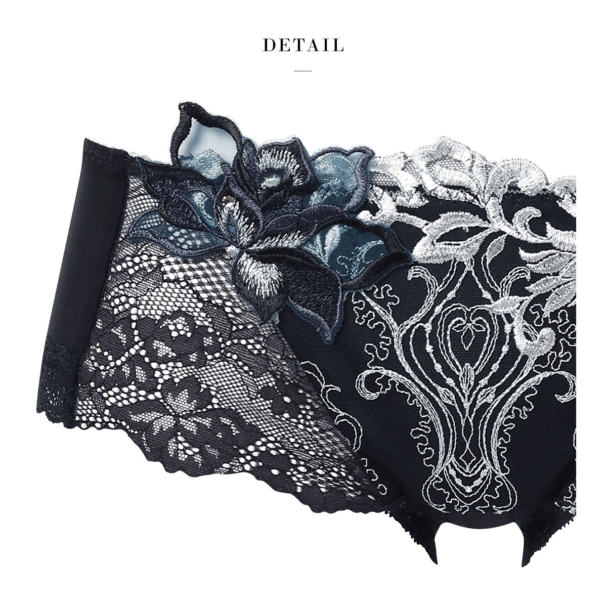 | 仕 様 | ・伸縮性:バックのみ縦横にあり ・クロッチ:付き ・透感:レース部分にあり(フロント裏打ちつき) ・股上:(M)約12cm (L)約13cm ※置き寸法 ・はきこみ丈:あさめ