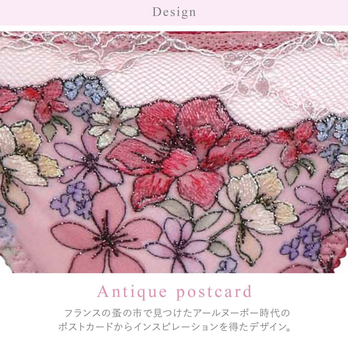 テーマは「Antique postcard(アンティークポストカード)」。フランスの蚤の市で見つけたアールヌーボー時代のポストカードからインスピレーションを得たデザイン。金で縁取られた草花や幾何学模様のモチーフを参考に、ラメ刺繍のエンブロイダリーレースやアップリケを使って表現しています。