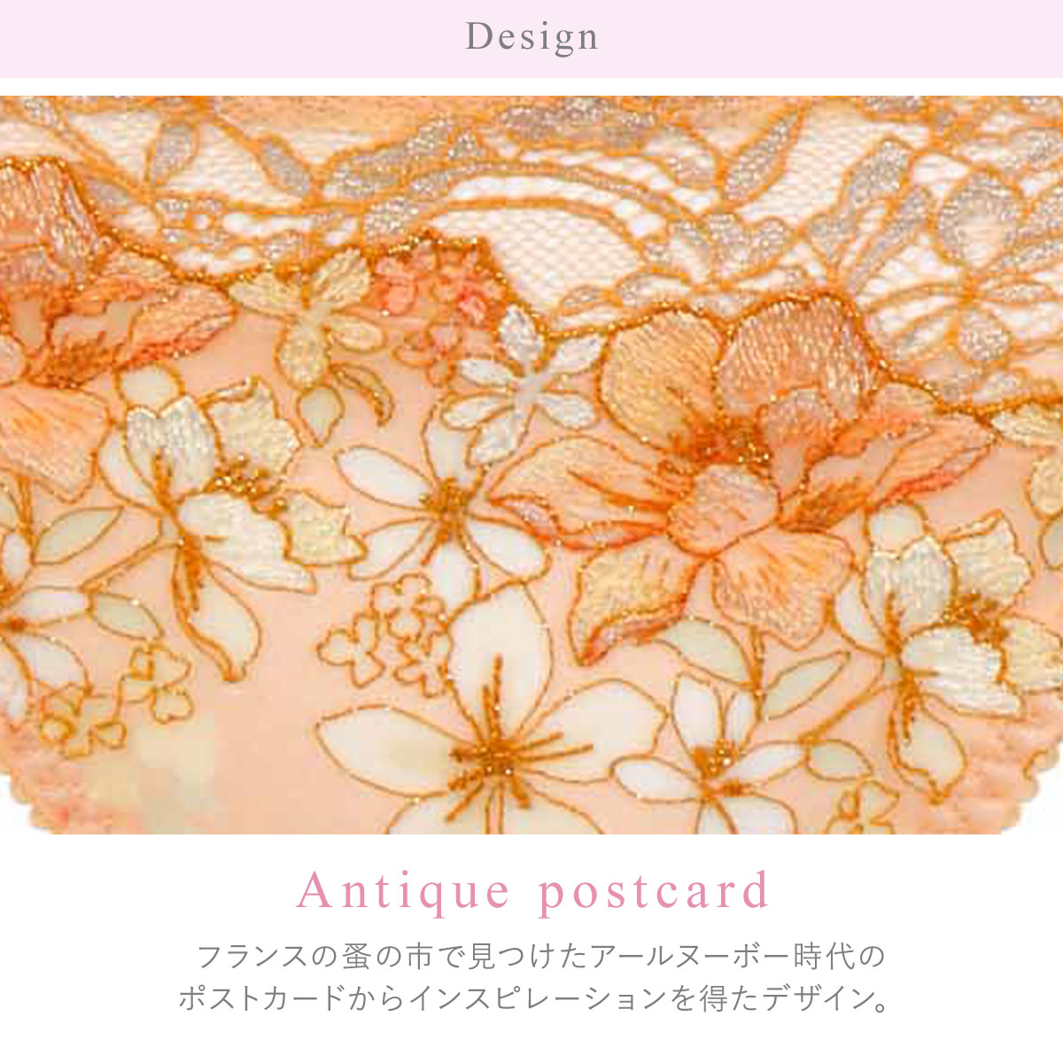 テーマは「Antique postcard(アンティークポストカード)」。フランスの蚤の市で見つけたアールヌーボー時代のポストカードからインスピレーションを得たデザイン。金で縁取られた草花や幾何学模様のモチーフを参考に、ラメ刺繍のエンブロイダリーレースやアップリケを使って表現しています。