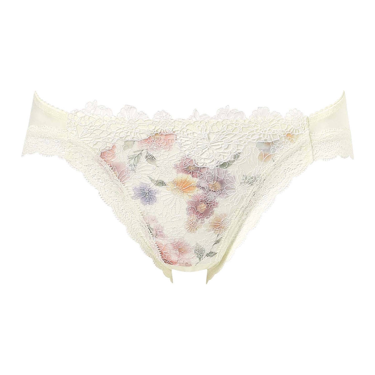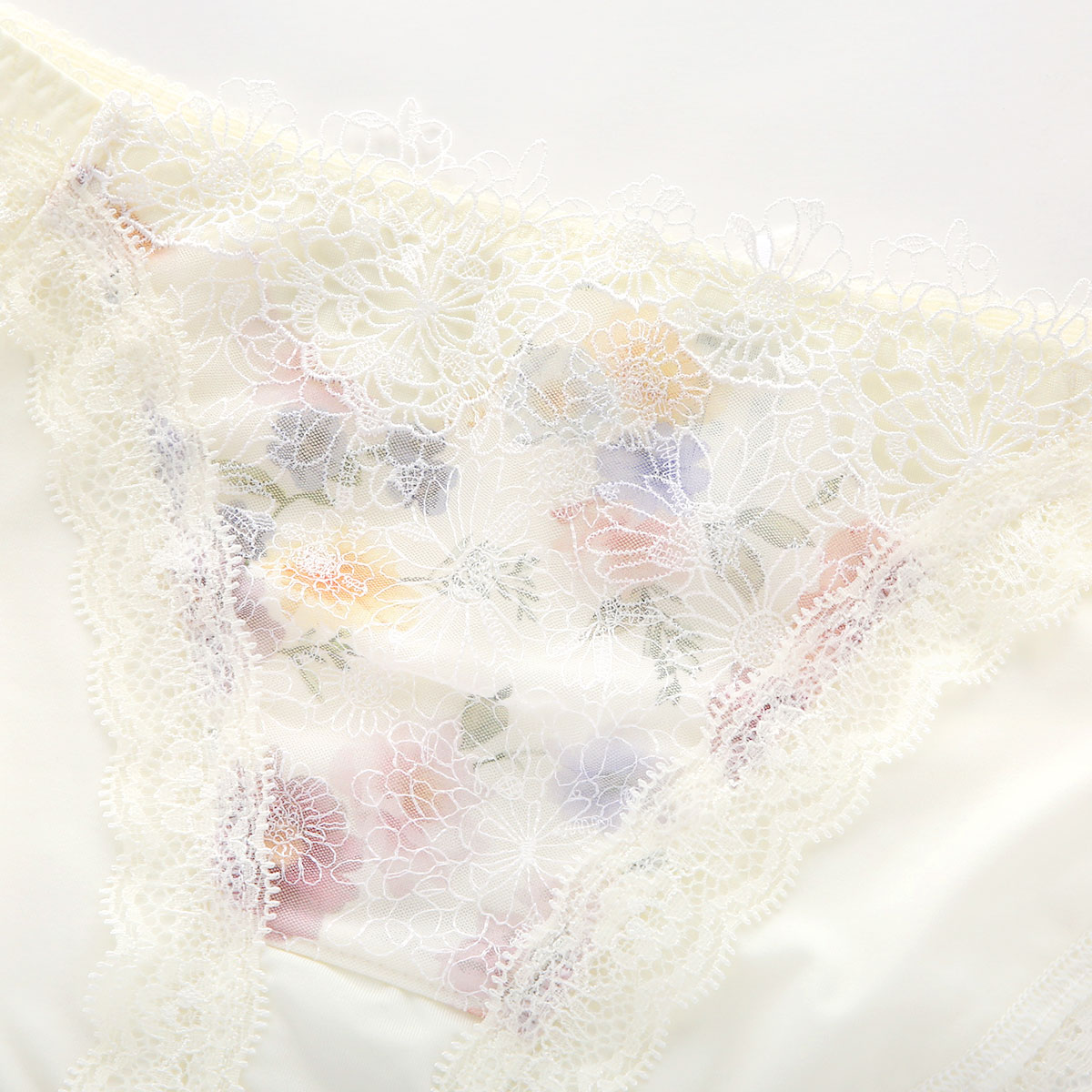 レトロポップな花柄のケミカルレースが贅沢なデザイン。繊細な細番手の糸を使ったインケミカルレースは透明感を演出。WH・YEカラーにはプリントをあしらい、華やかさを一層引き立てました。