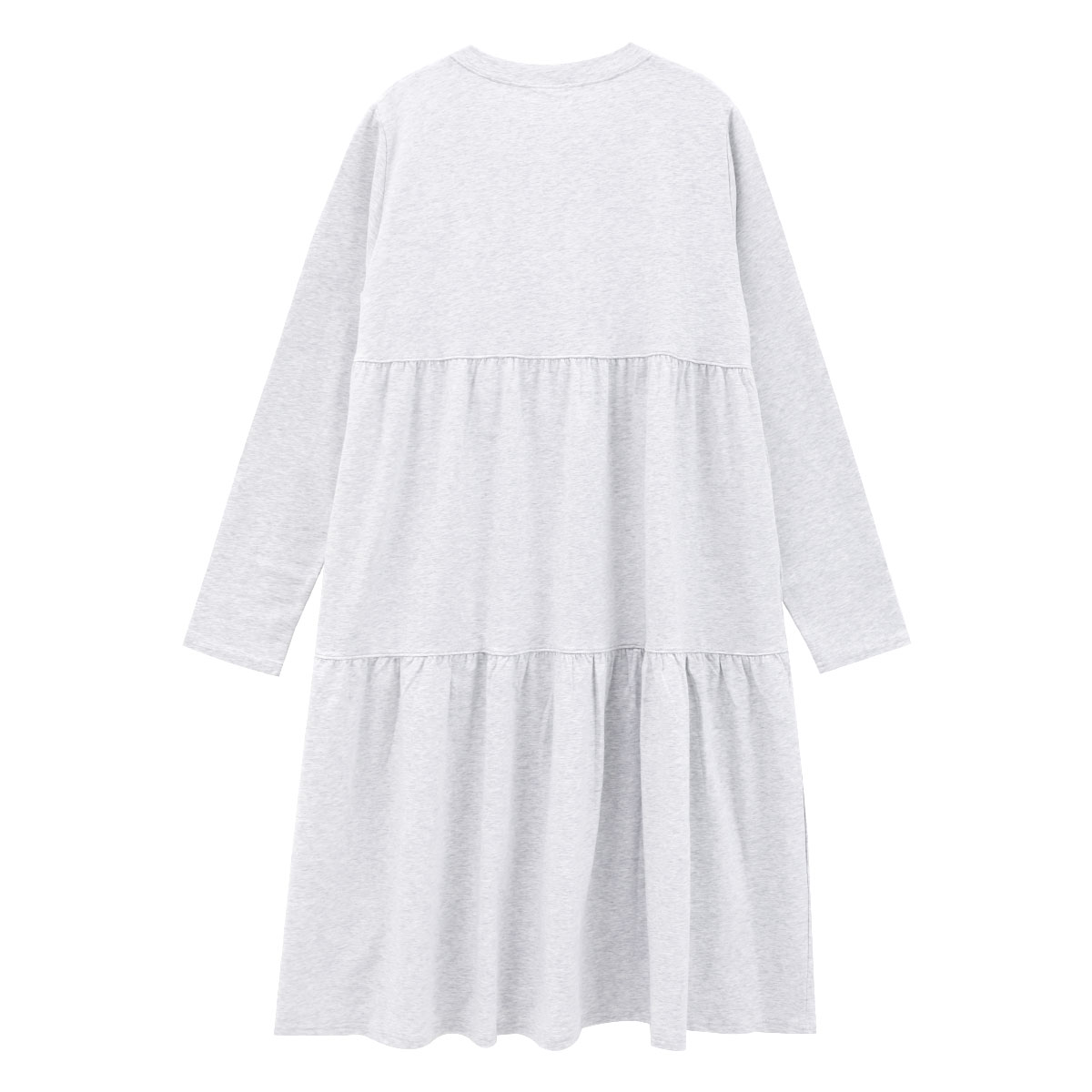 ベア天竺素材を使用したやわらかな肌ざわりのワンピースです。ストレッチ性のある薄手の生地で、軽やかな着ごこち。三段切り替えのティアードタイプで、ロングカーディガンとしても着まわしができます◎