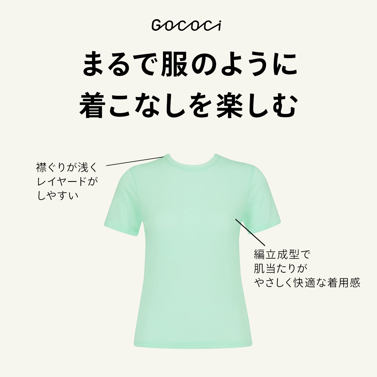 テンセル(TM)ブランド繊維混素材使用の編立成型で、身生地部分の切り替えがないため、肌当たりがやさしく快適な着用感です。からだのラインにほどよくなじむストレッチ性とフィット感がポイント。襟ぐりが浅くレイヤードがしやすく、様々なファッションに合わせやすいです。