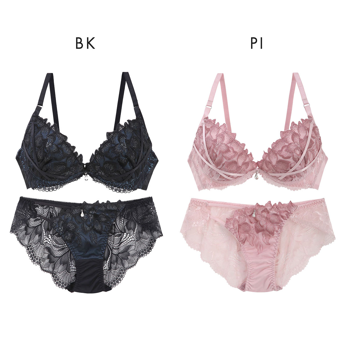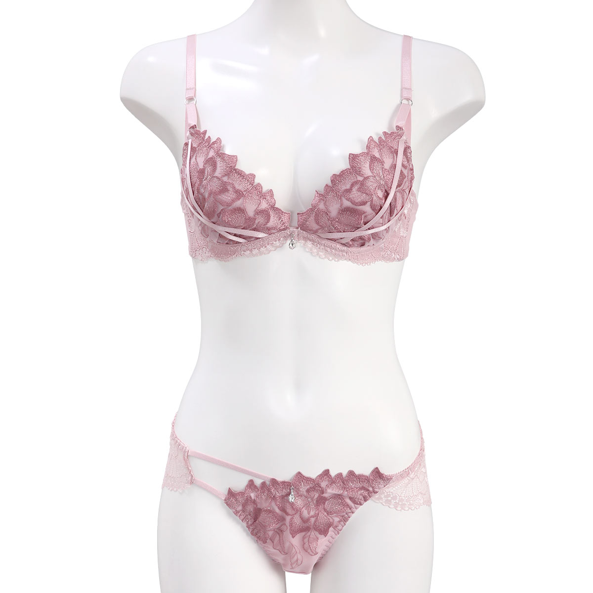 ラメの煌めきを湛えた大花刺繍レースがエレガントなブラセット。セクシーなストリング使いがポイントです。前中心に揺れるストーンアクセサリーも、さり気なくアクセントを添えています。