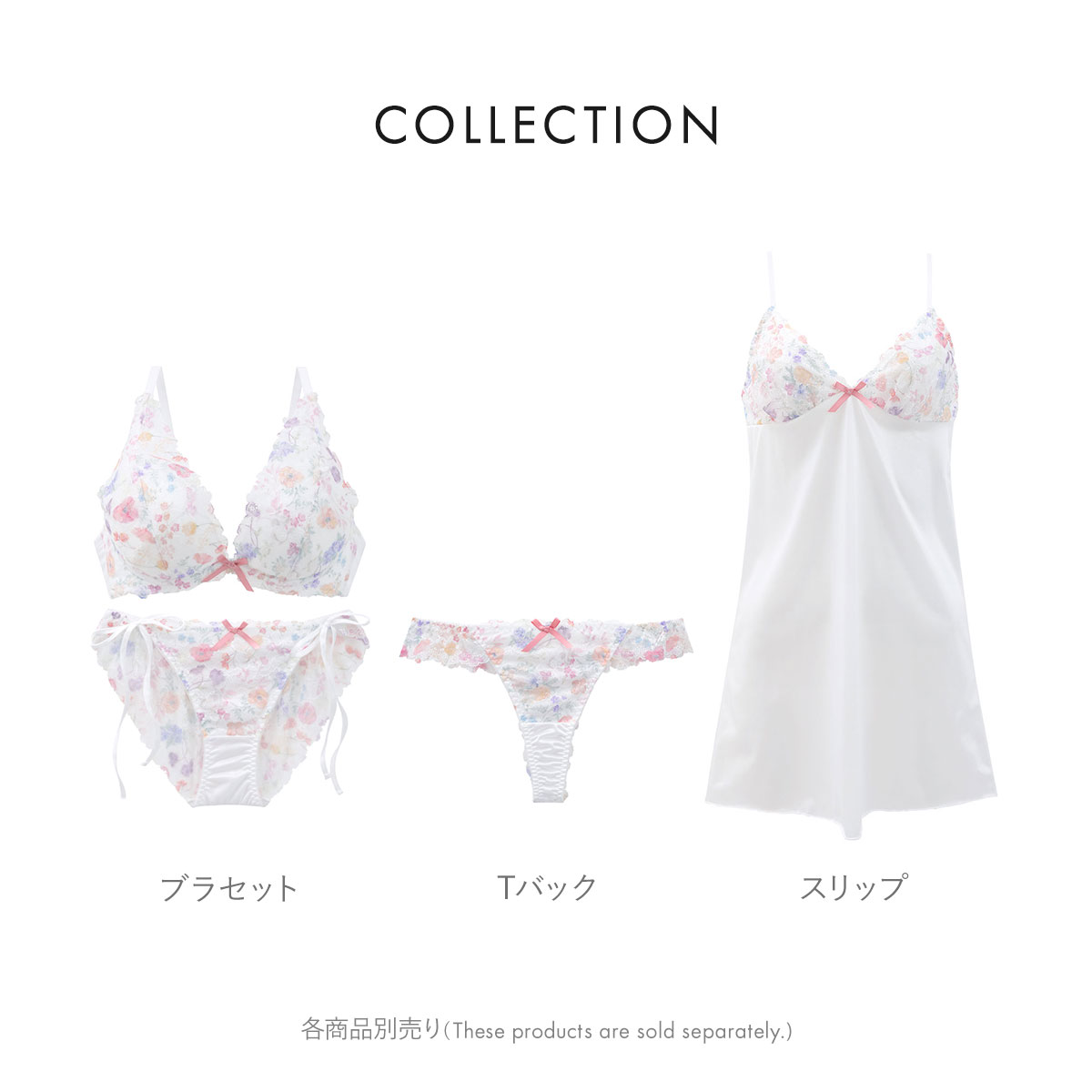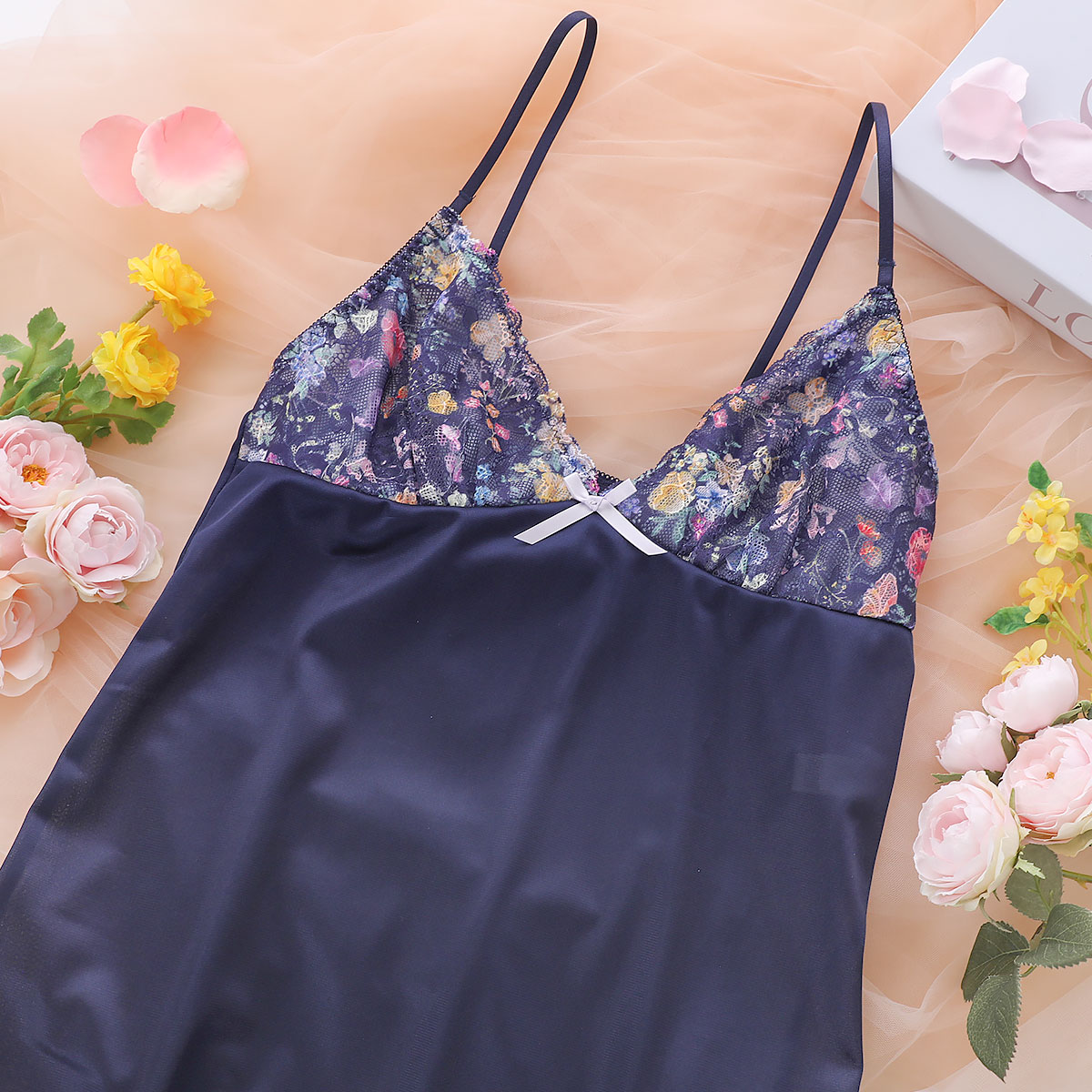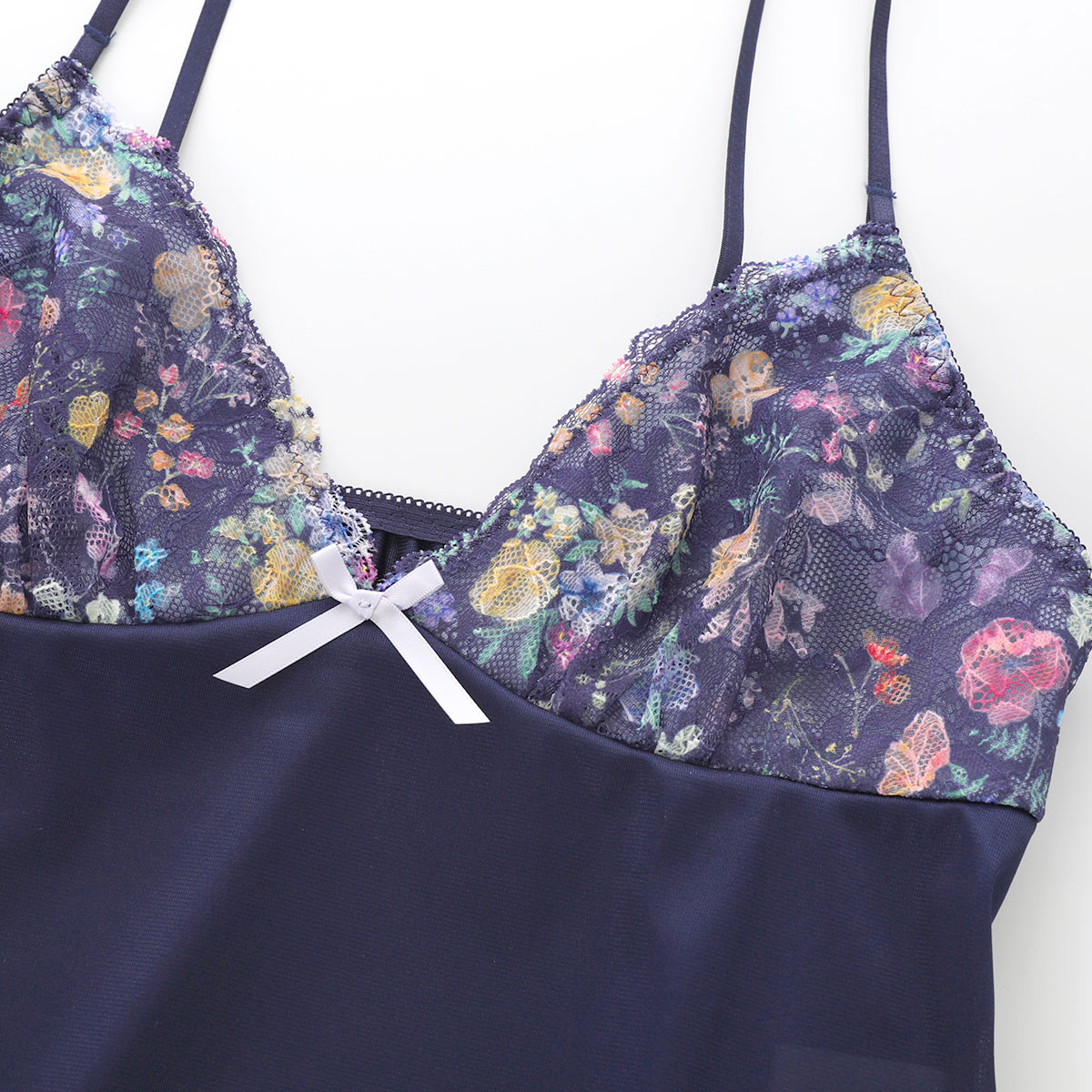 色彩豊かなフラワープリントレースを胸元に使用した華やかなスリップ。前中心には身生地と配色のサテンリボンをあしらい、アクセントを添えています。
