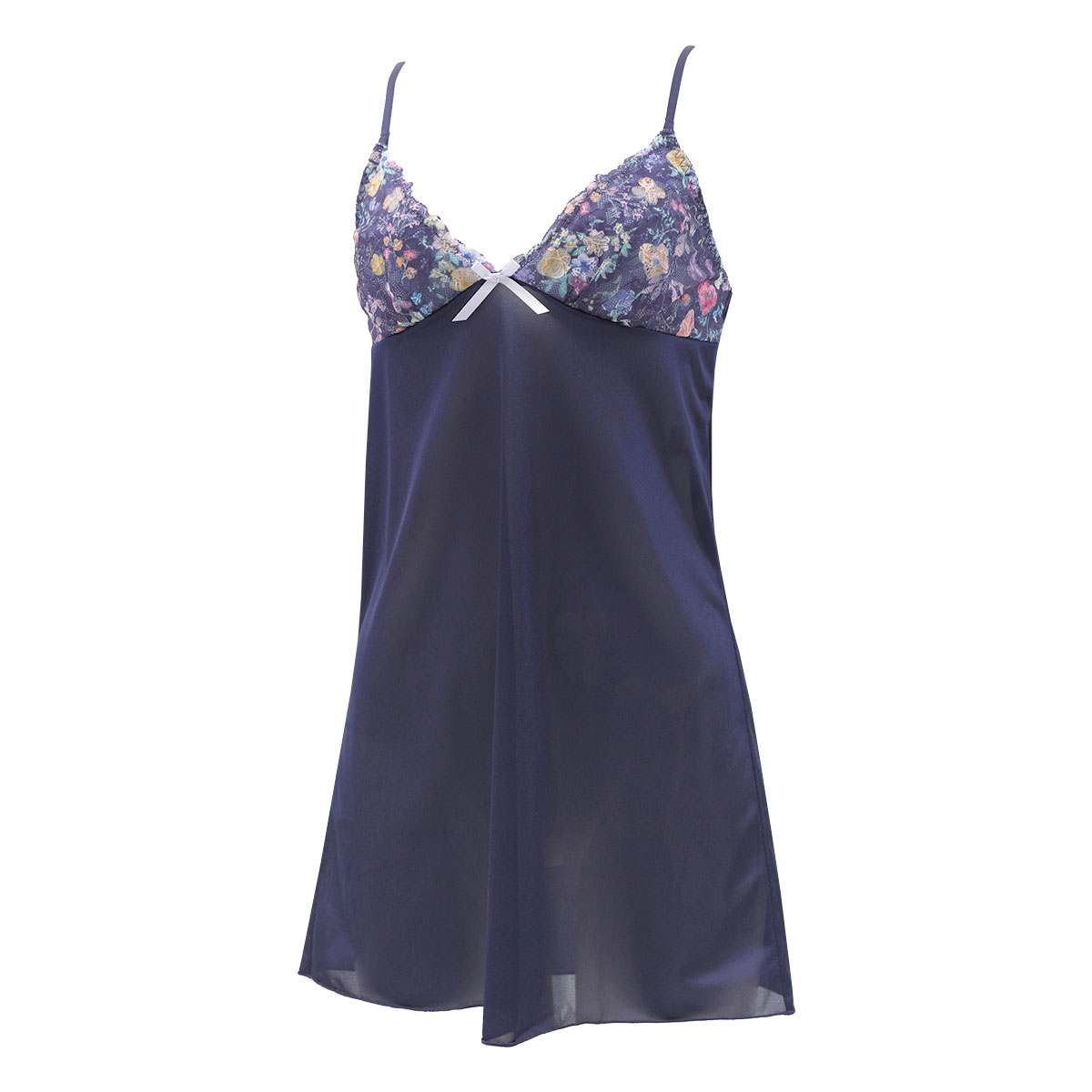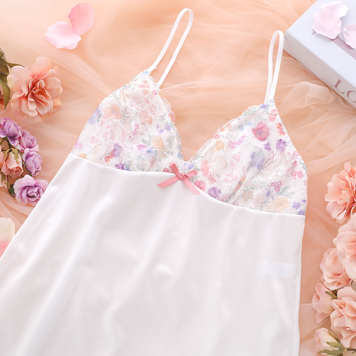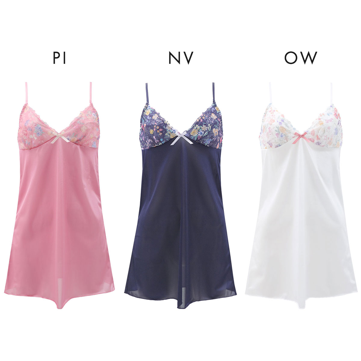 色彩豊かなフラワープリントレースを胸元に使用した華やかなスリップ。前中心には身生地と配色のサテンリボンをあしらい、アクセントを添えています。