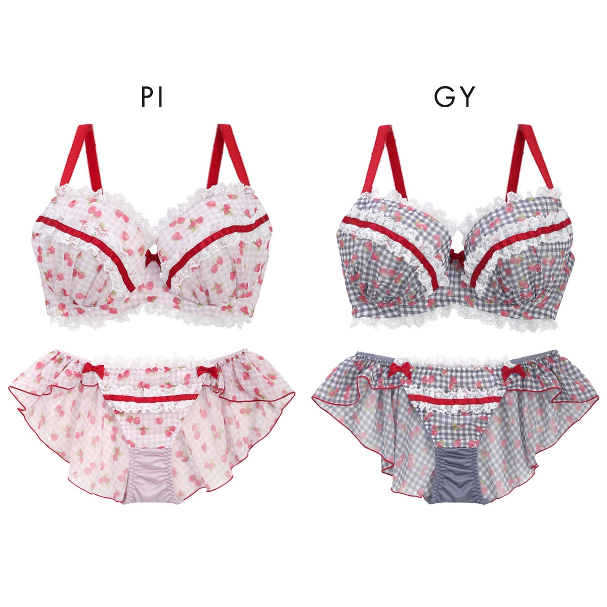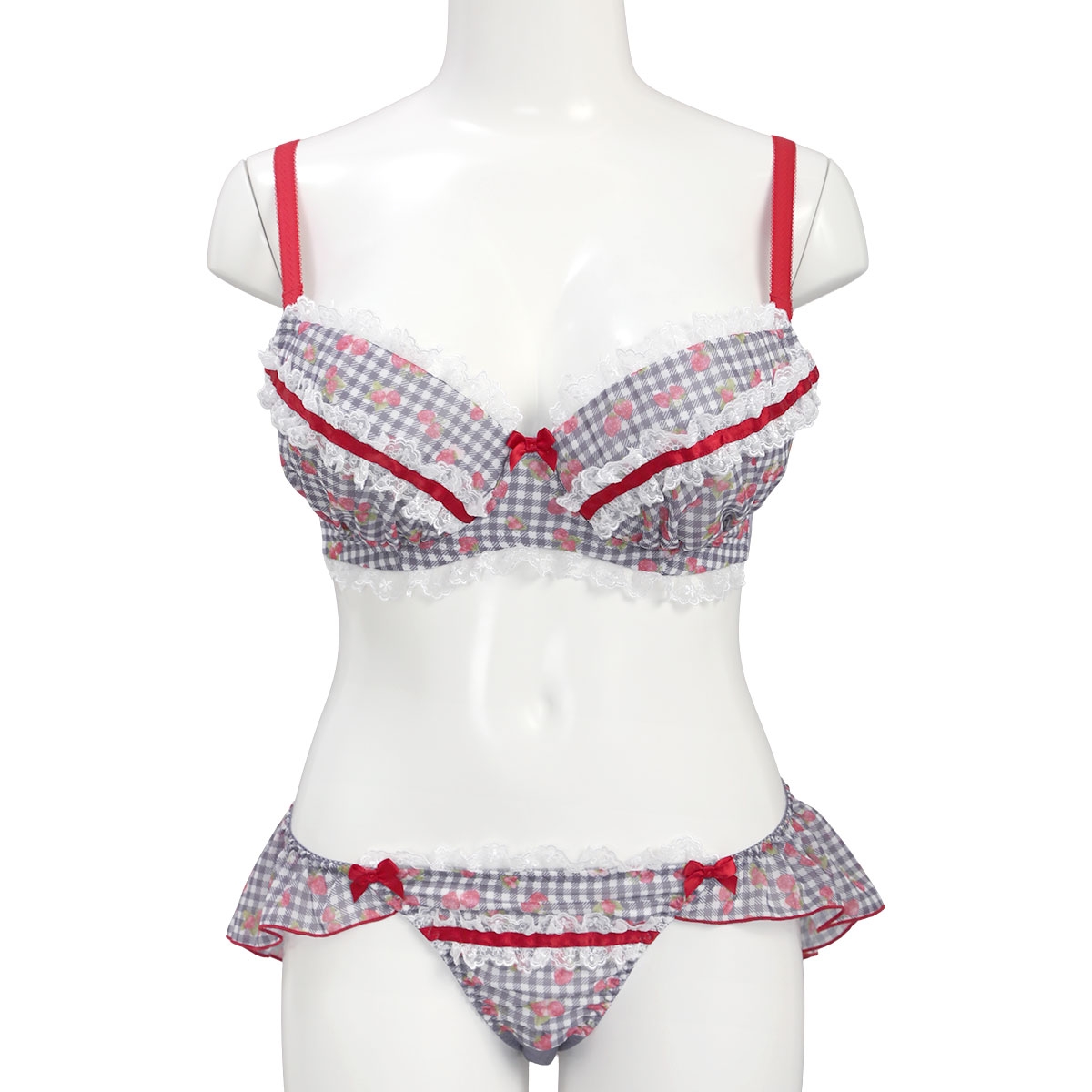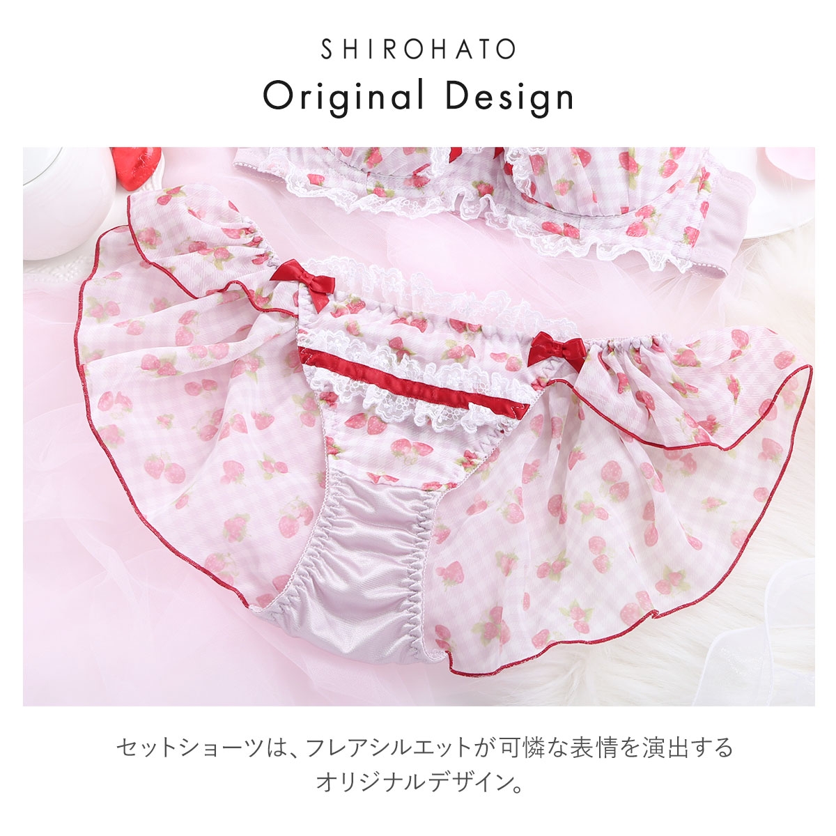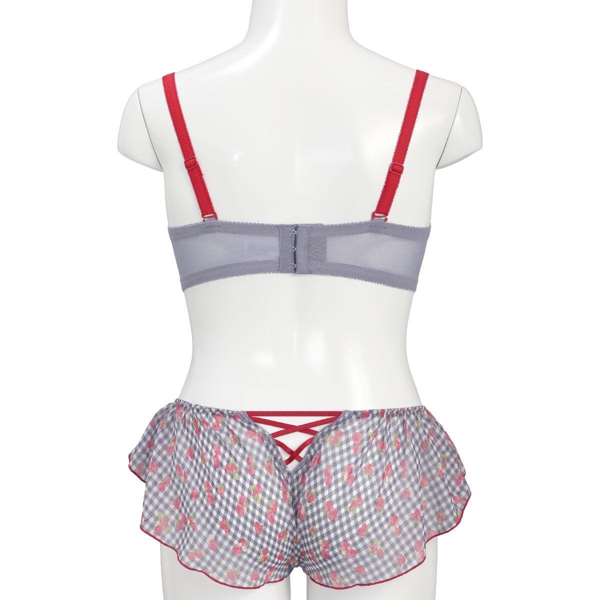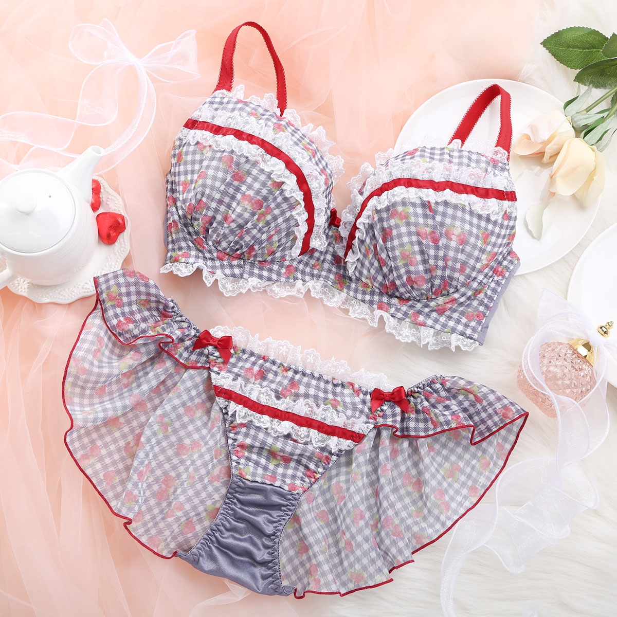 苺とチェック柄のシフォンがキュートなブラ&別注フレアショーツ