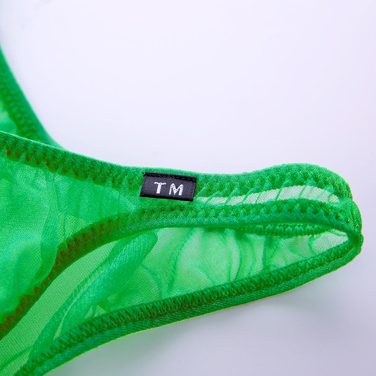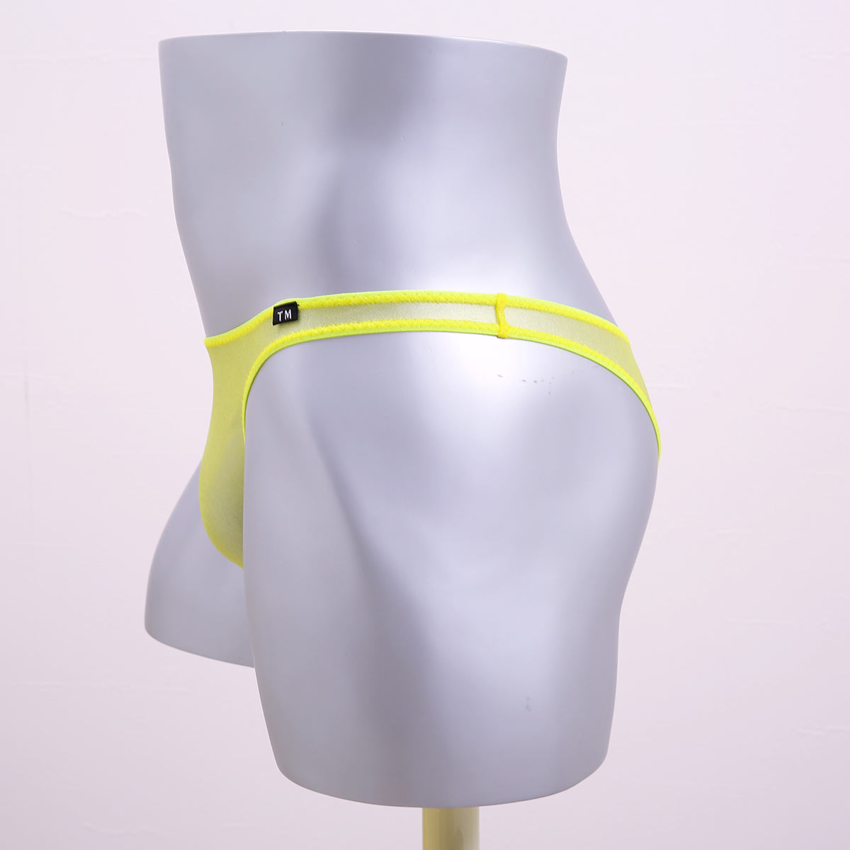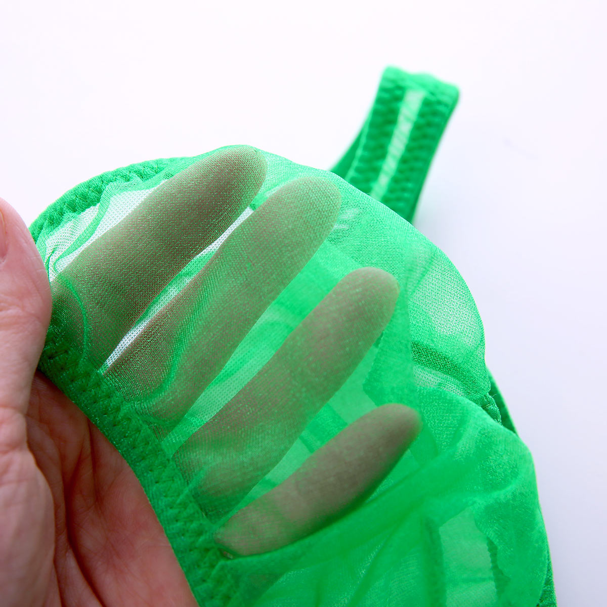 生地は、極薄でやわらか、キラキラとした光沢感のあるスっケスケのシースルー素材「スパークハーフ」を使用。パターンはオーソドックスなビキニスタイル。フロントはハーフシームを入れ、収まりをよくしています。