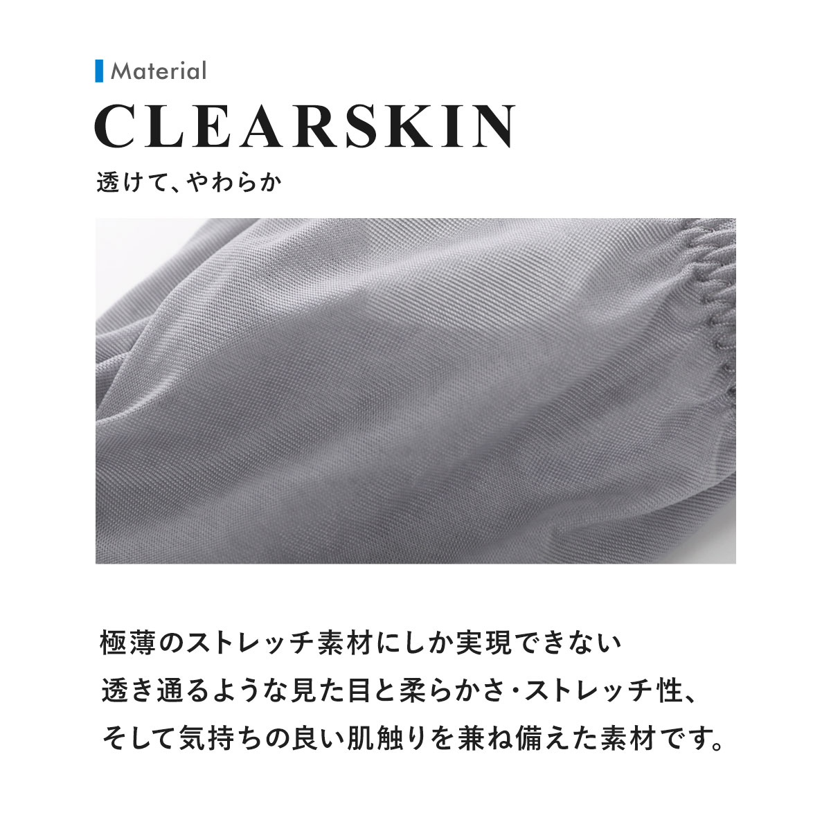 クリアースキン(透きとおるような見た目と柔らかさ・ストレッチ性・肌ざわりを兼ね備えた素材)を使用したもっこりシャープスタイルの上向き収納バージョンのTバックビキニです。ジャストインパクトとは違いなめらかな曲線で上向きにもっていくパターンです。