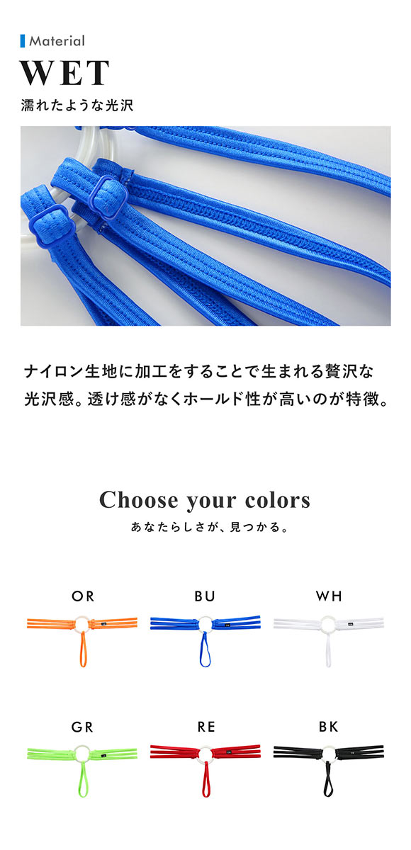 フロントとバックのパールリングにWET素材のストリングが7本ついているので、股下1本、3本、5本といろんなはき方が楽しめます。