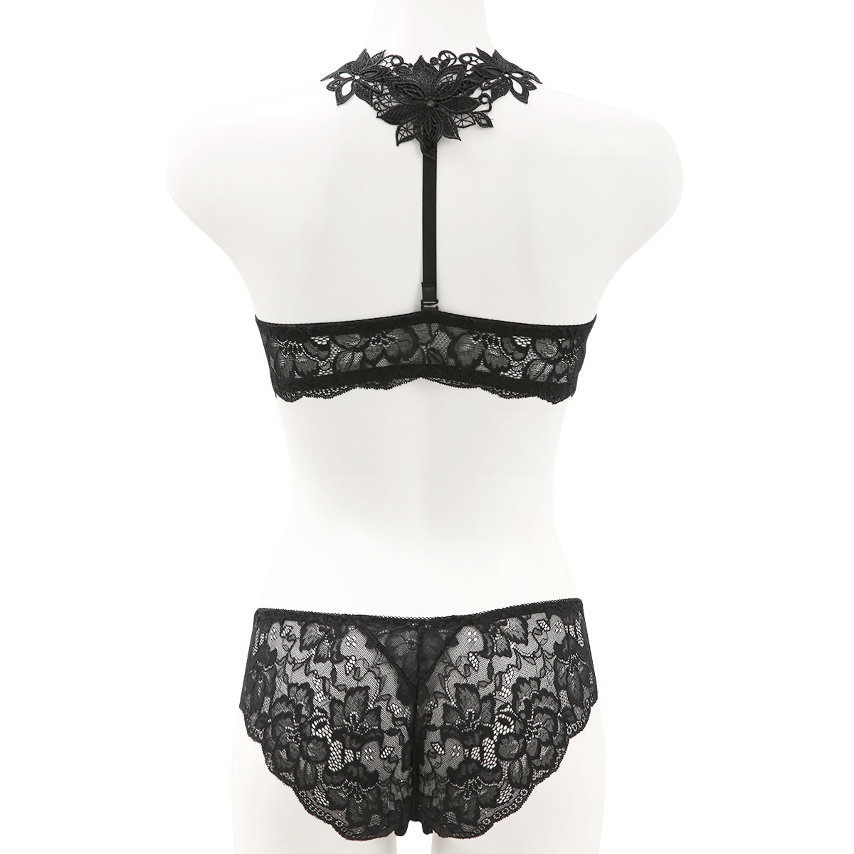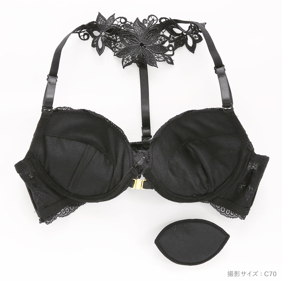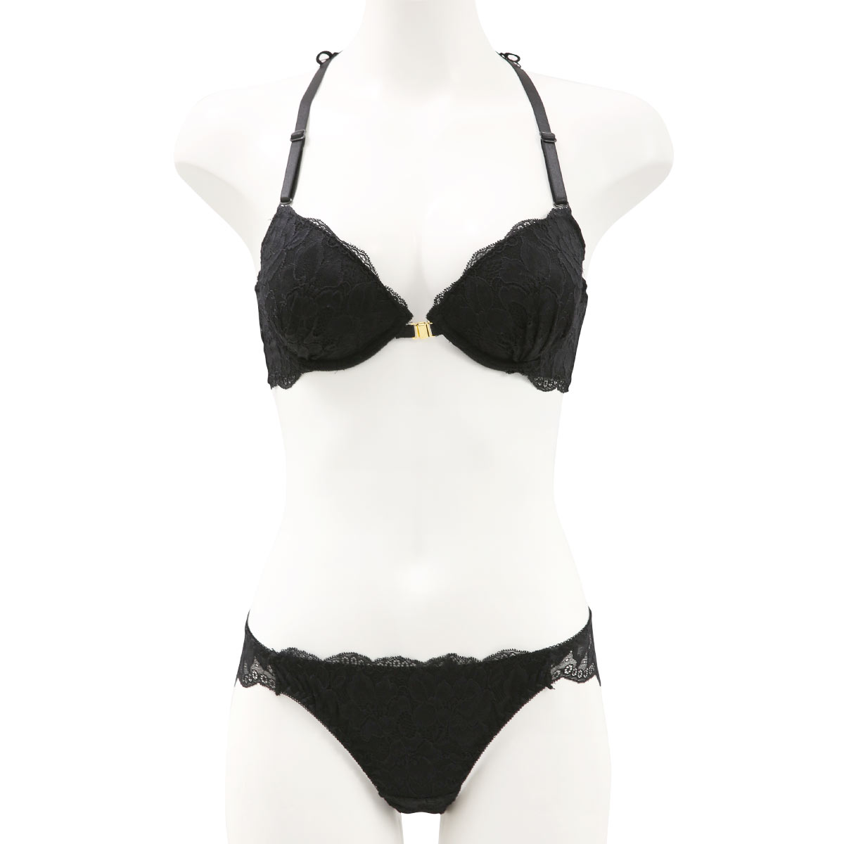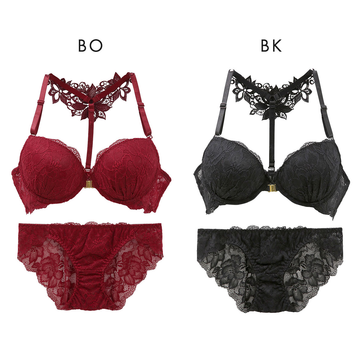 アップリケをあしらった背中魅せのデザインが華やかなフロントホックのブラショーツセット。アンダーからバックまでストレッチレースを贅沢に使用し、インポート風のセクシーな雰囲気に仕上げています。