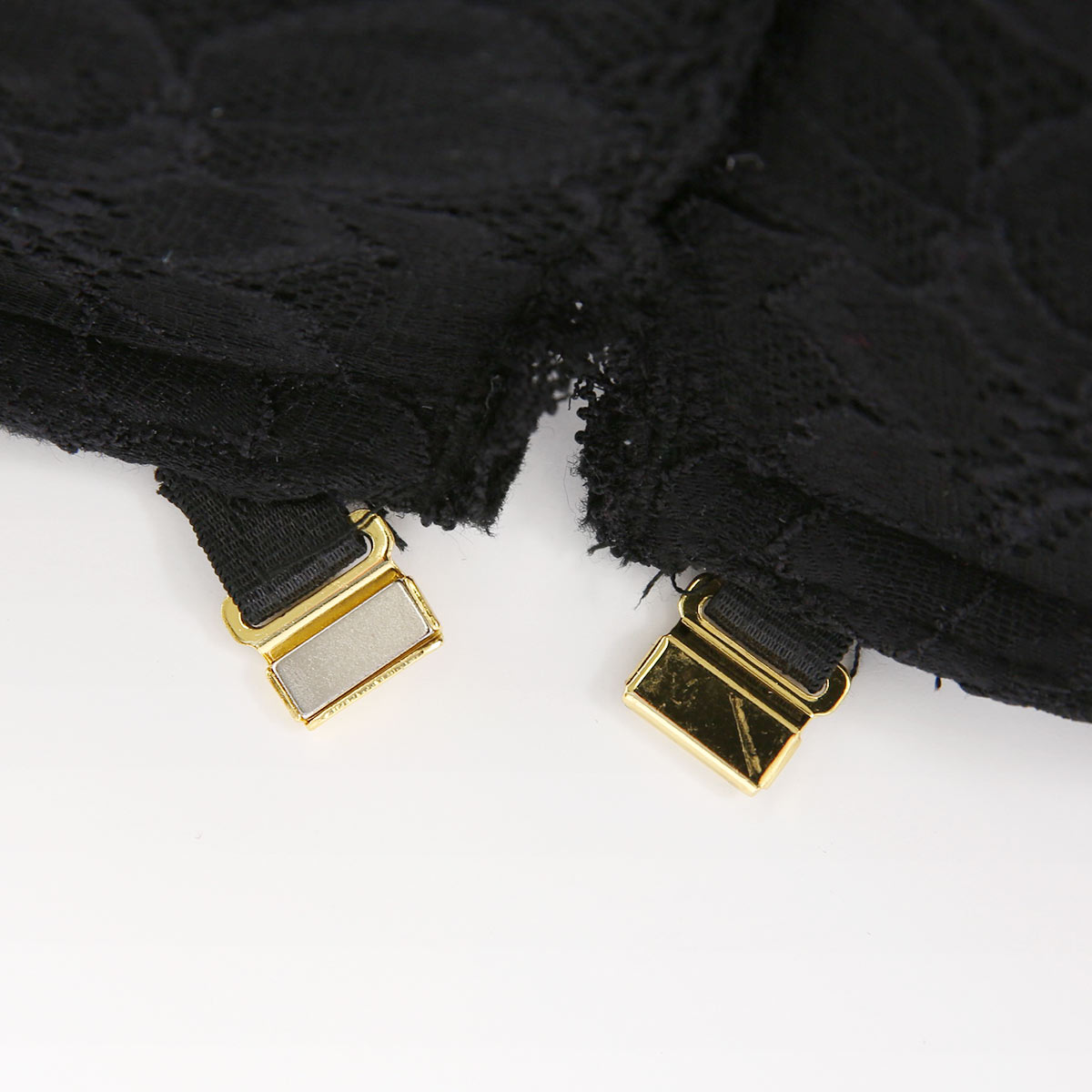 カップ脇は伸び止めの裏打ちとサイドボーン入りで、着装時の安定感をアップ。バックベルトはストレッチレースとやわらかく伸縮するアンダーゴムテープを使用しているので軽く心地よいフィット感。肩ストラップは長さ調整がしやすいようフロントにアジャスターが付いています。