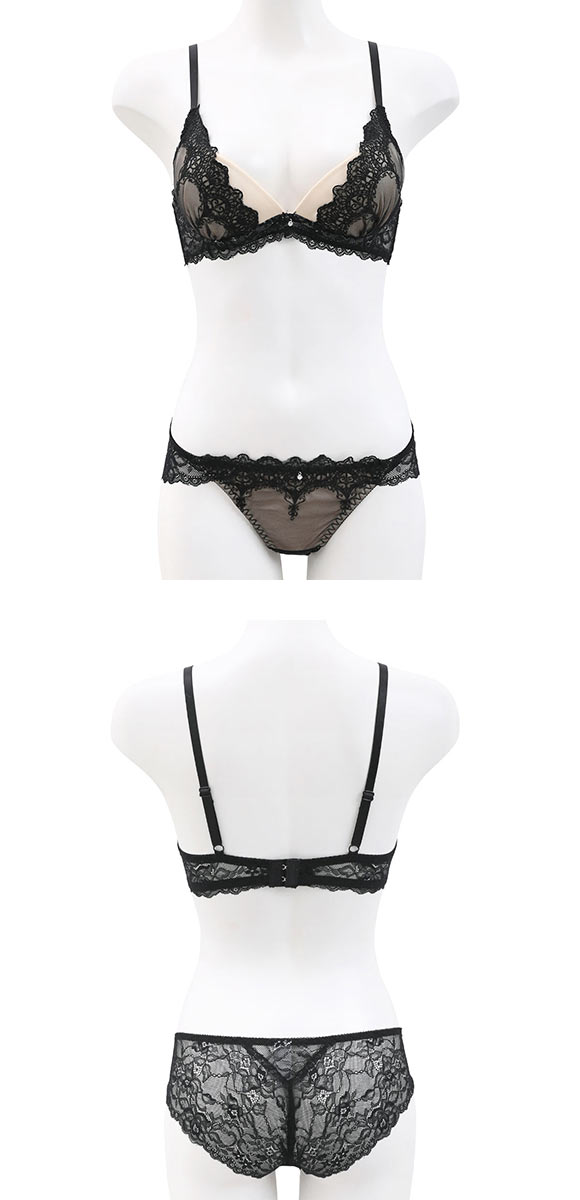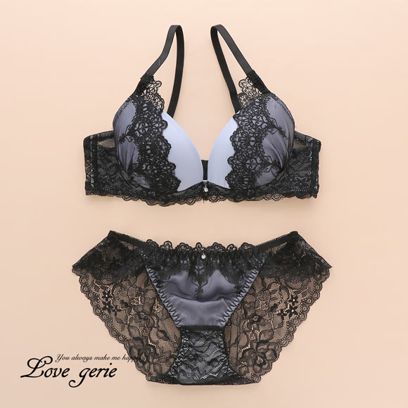 ブラックのアーチ刺繍が高級感とエレガンスを漂わせる、繊細で落ち着いた印象のブラショーツセット。アンダーからバックまで総レースで仕上げた、上品で大人なデザインです。