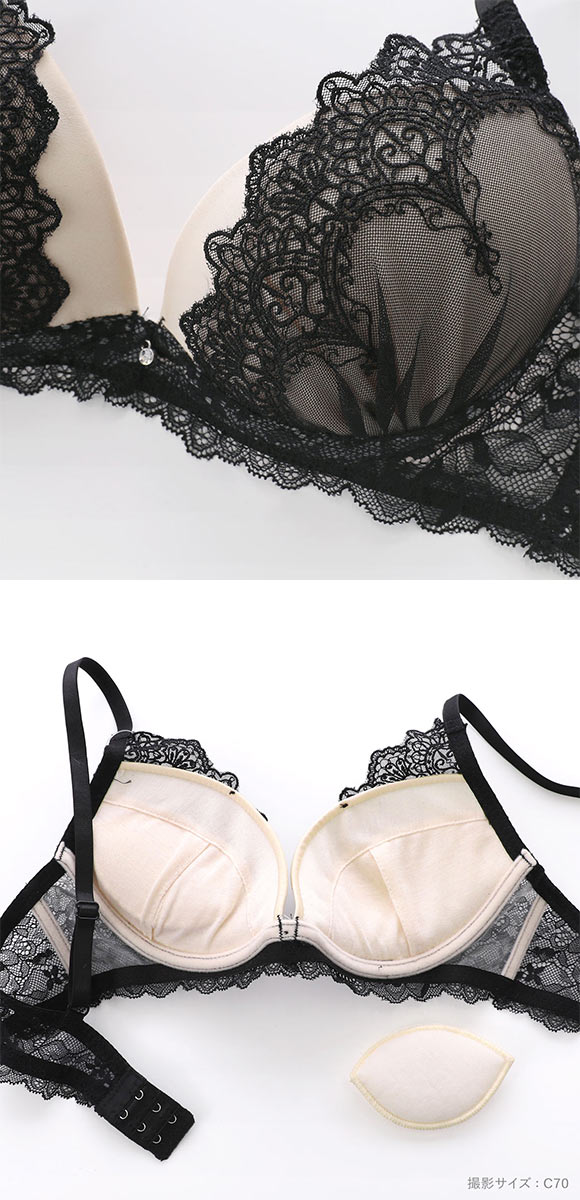 ブラはもっちり下厚モールドカップ+取り外し可能なパッドのWパッド仕様でくっきり谷間をメイク。バストボリュームの調整ができるのも嬉しいポイントです。