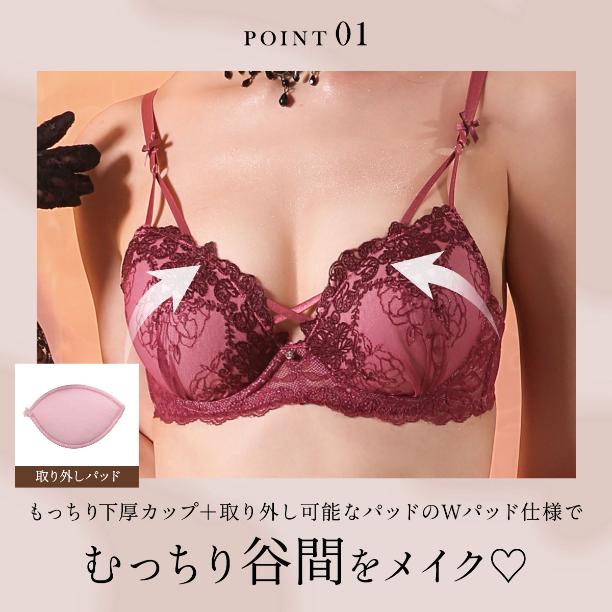 ブラはもっちり下厚モールドカップ+取り外し可能なパッドのWパッド仕様でむっちり谷間をメイク。バストボリュームの調整ができるのも嬉しいポイントです。