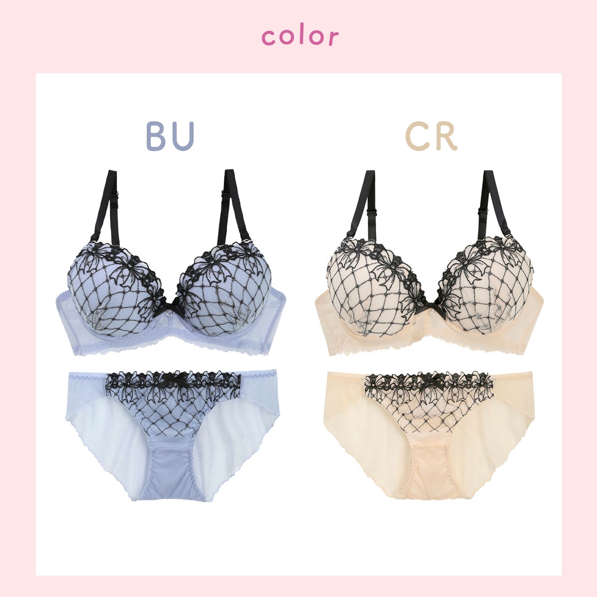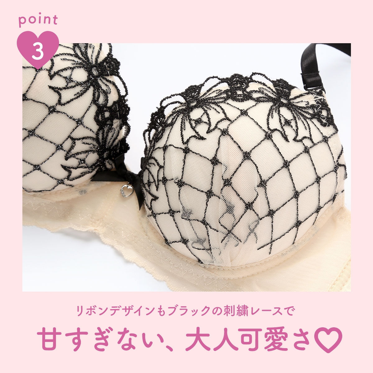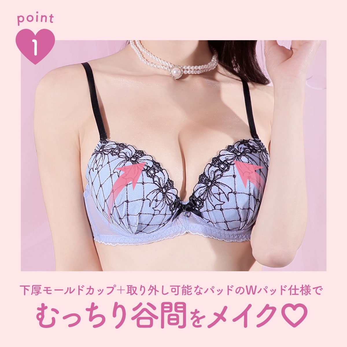 厚盛りパッドでむっちり谷間♪キュートなリボンの刺繍レースに気分がアガるブラセット☆
