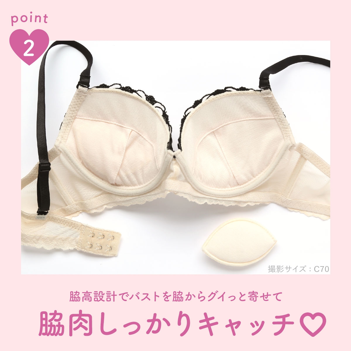 ブラはもっちり下厚モールドカップ+取り外し可能なパッドのWパッド仕様でむっちり谷間をメイク。バストボリュームの調整ができるのも嬉しいポイントです。