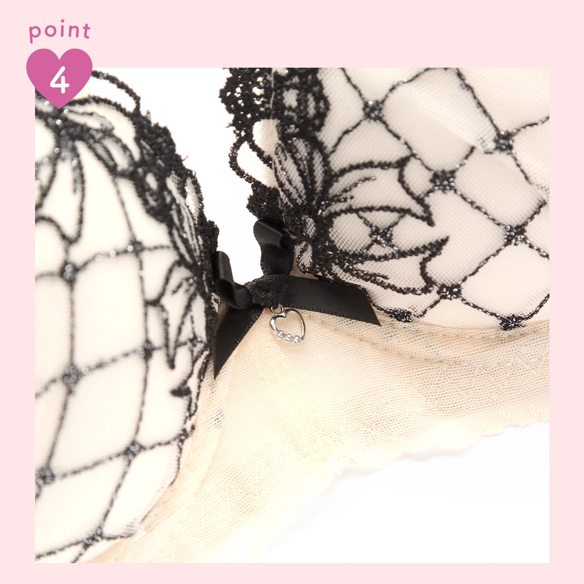 カップ全体を覆うようなクロスデザインが目を惹くデザイン。カップ上部のリボンデザインもブラックの刺繍レースで甘すぎない、大人可愛さを演出します。胸元のチャームはストーン付きのハートモチーフ♪
