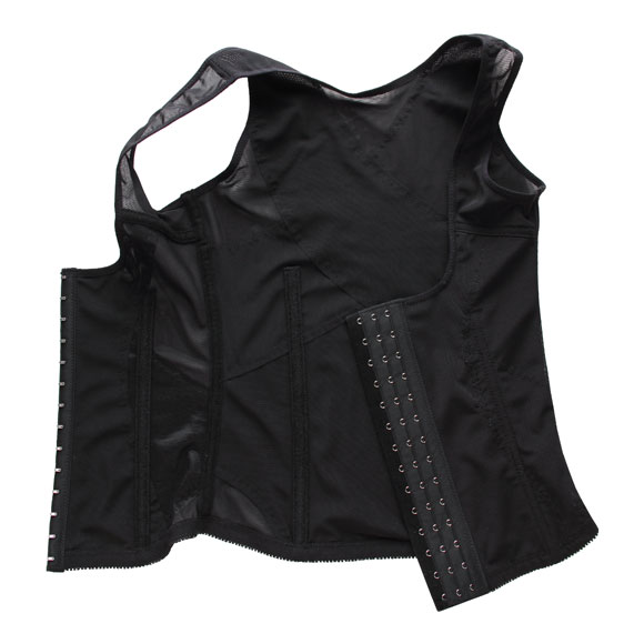 キュッと引締めて見せるボディコントロール機能のあるコルセット。バスト下から下辺までに3段階の調節ホックが付いています。