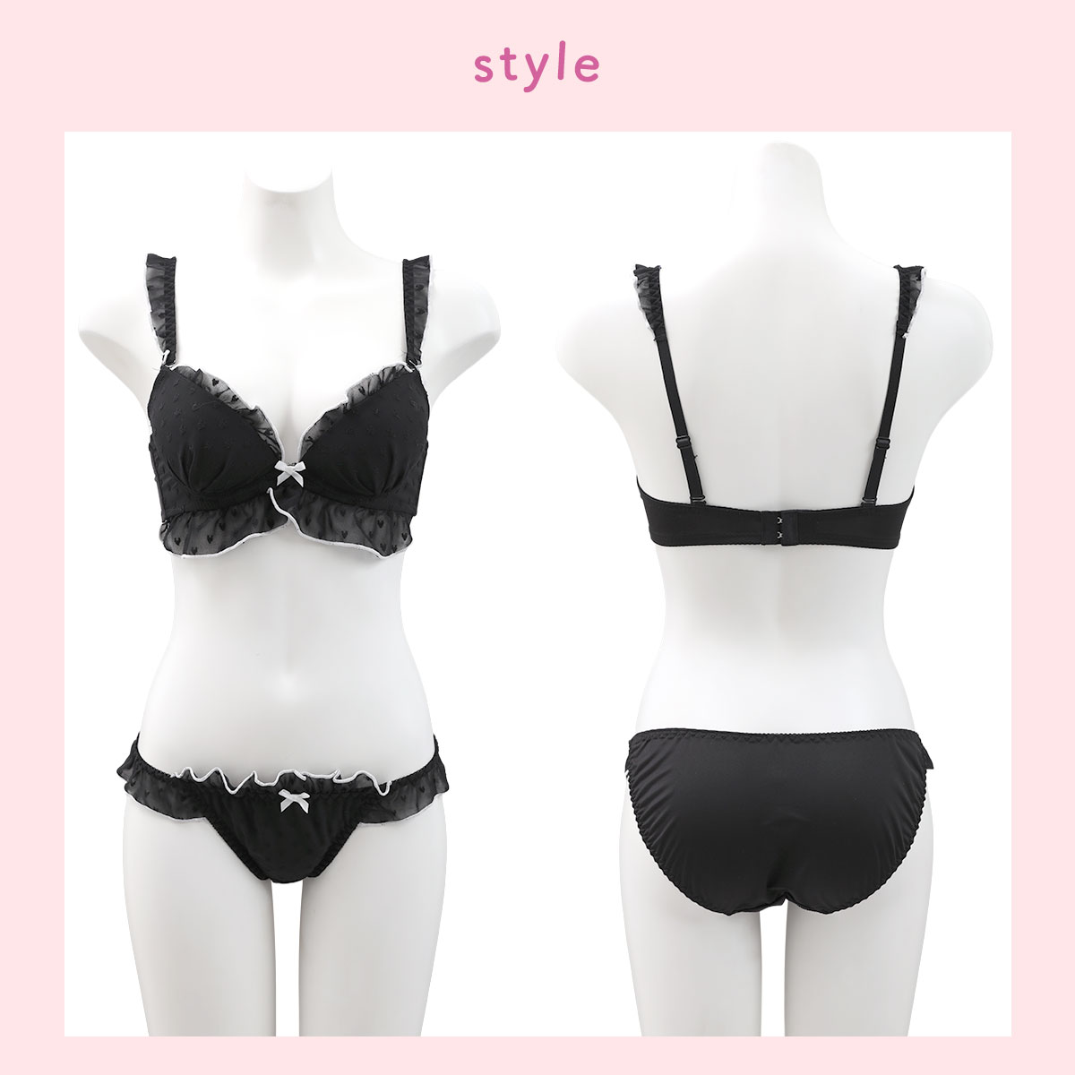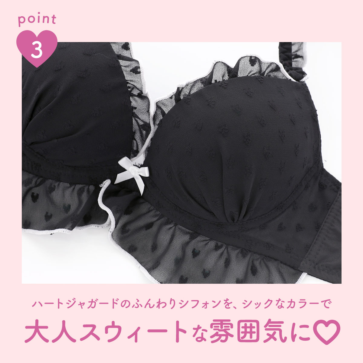 大人気のデザインが再入荷!ハートジャガードのふんわりシフォンを、シックなカラーで大人スウィートな雰囲気に♪ストラップとバスト下にはメロウフリル、胸中心にはリボンをあしらったロマンティックなブラセットです。