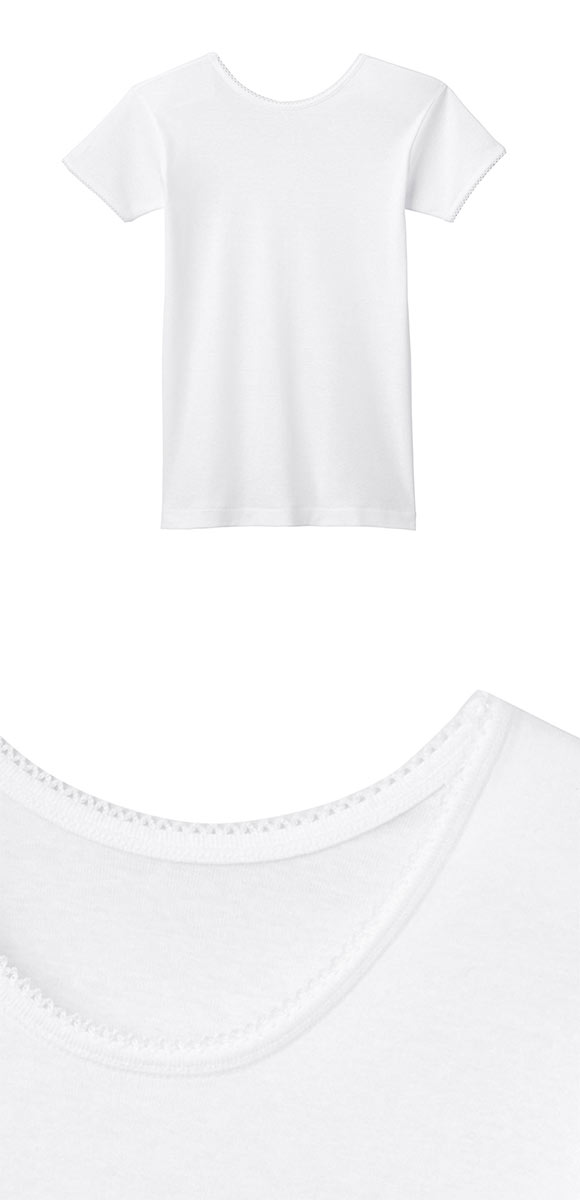 グンゼの女の子用肌着です。襟のピコレースがさりげなくかわいい、シンプルなクルーネック半袖Tシャツの2枚セット。オールシーズン対応でやわらかくサラっとした風合いの綿100%素材です。