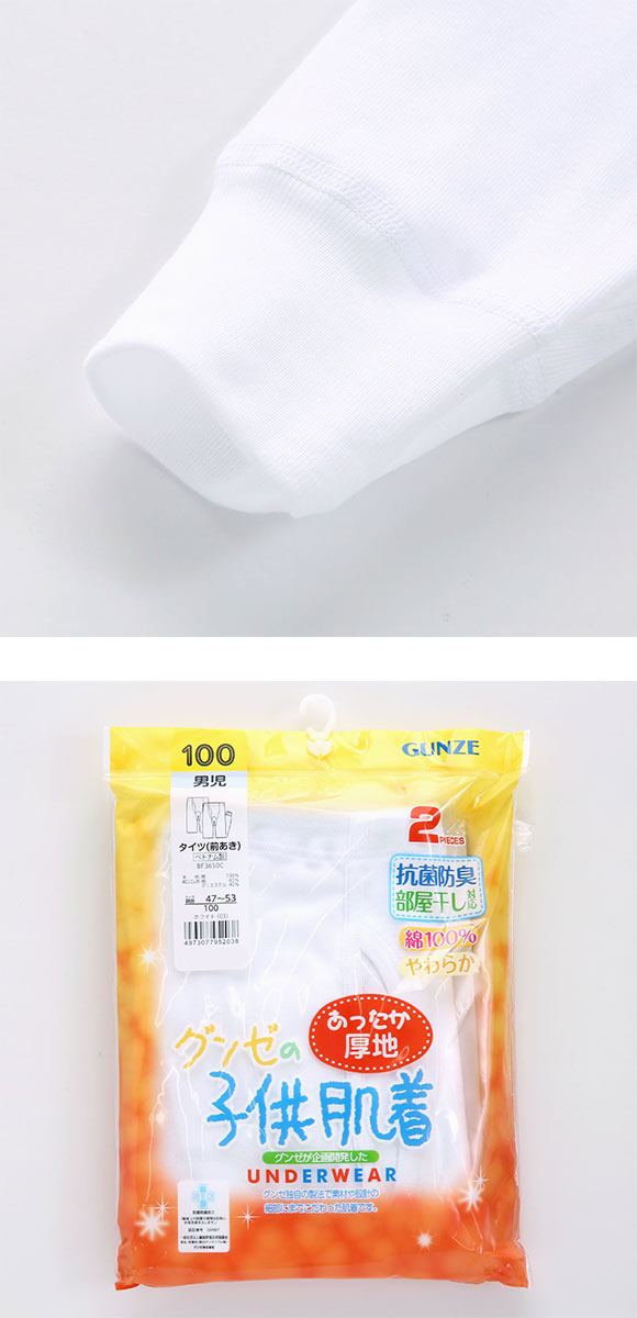 グンゼの男の子用肌着です。シンプルなデザインの前あきタイツ2枚セットです。オールシーズン対応でやわらかくサラっとした風合いの本体綿100%素材です。